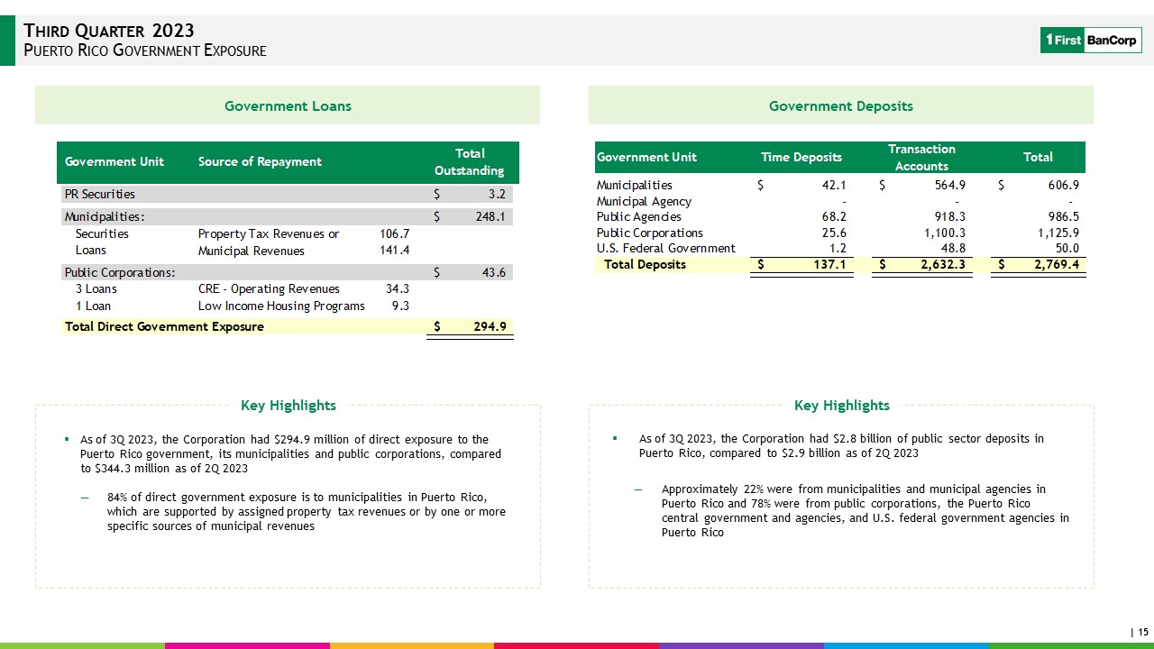 Third Quarter 2023 Puerto Rico Government Exposure  Government Loans  Key Highlights  Government Deposits  Key Highlights  As of 3Q 2023, the Corporation had $294.9 million of direct exposure to the Puerto Rico government, its municipalities and public corporations, compared to $344.3 million as of 2Q 2023  84% of direct government exposure is to municipalities in Puerto Rico, which are supported by assigned property tax revenues or by one or more specific sources of municipal revenues  As of 3Q 2023, the Corporation had $2.8 billion of public sector deposits in Puerto Rico, compared to $2.9 billion as of 2Q 2023  Approximately 22% were from municipalities and municipal agencies in Puerto Rico and 78% were from public corporations, the Puerto Rico central government and agencies, and U.S. federal government agencies in Puerto Rico