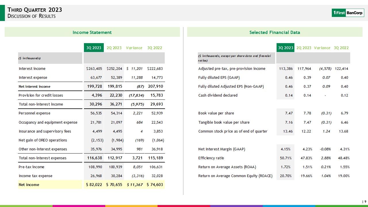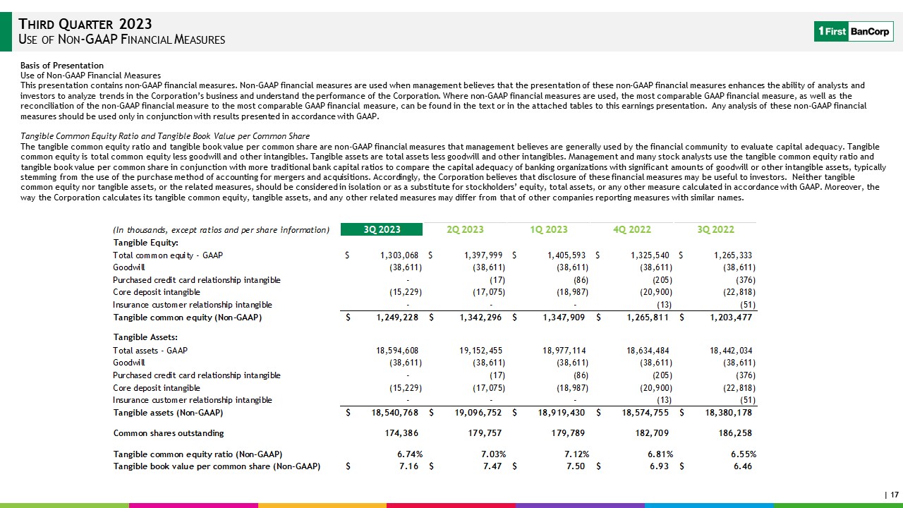 Third Quarter 2023Use of Non-GAAP Financial Measures  Basis of Presentation  Use of Non-GAAP Financial Measures   This presentation contains non-GAAP financial measures. Non-GAAP financial measures are used when management believes that the presentation of these non-GAAP financial measures enhances the ability of analysts and investors to analyze trends in the Corporation’s business and understand the performance of the Corporation. Where non-GAAP financial measures are used, the most comparable GAAP financial measure, as well as the reconciliation of the non-GAAP financial measure to the most comparable GAAP financial measure, can be found in the text or in the attached tables to this earnings presentation. Any analysis of these non-GAAP financial measures should be used only in conjunction with results presented in accordance with GAAP.   Tangible Common Equity Ratio and Tangible Book Value per Common Share   The tangible common equity ratio and tangible book value per common share are non-GAAP financial measures that management believes are generally used by the financial community to evaluate capital adequacy. Tangible common equity is total common equity less goodwill and other intangibles. Tangible assets are total assets less goodwill and other intangibles. Management and many stock analysts use the tangible common equity ratio and tangible book value per common share in conjunction with more traditional bank capital ratios to compare the capital adequacy of banking organizations with significant amounts of goodwill or other intangible assets, typically stemming from the use of the purchase method of accounting for mergers and acquisitions. Accordingly, the Corporation believes that disclosure of these financial measures may be useful to investors. Neither tangible common equity nor tangible assets, or the related measures, should be considered in isolation or as a substitute for stockholders’ equity, total assets, or any other measure calculated in accordance with GAAP. Moreover, the way the Corporation calculates its tangible common equity, tangible assets, and any other related measures may differ from that of other companies reporting measures with similar names.