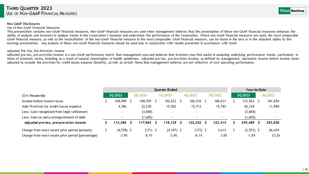 Third Quarter 2023Use of Non-GAAP Financial Measures  Non-GAAP Disclosures  Use of Non-GAAP Financial Measures   This presentation contains non-GAAP financial measures. Non-GAAP financial measures are used when management believes that the presentation of these non-GAAP financial measures enhances the ability of analysts and investors to analyze trends in the Corporation’s business and understand the performance of the Corporation. Where non-GAAP financial measures are used, the most comparable GAAP financial measure, as well as the reconciliation of the non-GAAP financial measure to the most comparable GAAP financial measure, can be found in the text or in the attached tables to this earnings presentation. Any analysis of these non-GAAP financial measures should be used only in conjunction with results presented in accordance with GAAP.   Adjusted Pre-Tax, Pre-Provision Income   Adjusted pre-tax, pre-provision income is a non-GAAP performance metric that management uses and believes that investors may find useful in analyzing underlying performance trends, particularly in times of economic stress, including as a result of natural catastrophes or health epidemies. Adjusted pre-tax, pre-provision income, as defined by management, represents income before income taxes adjusted to exclude the provision for credit losses expense (benefit), as well as certain items that management believes are not reflective of core operating performance.