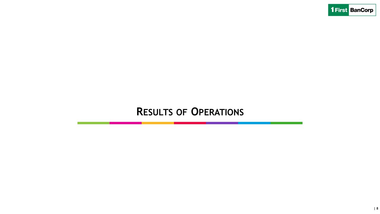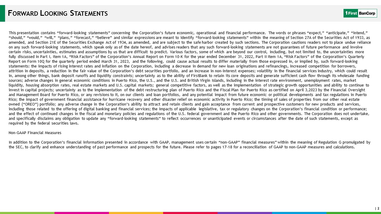 Forward Looking Statements  This presentation contains “forward-looking statements” concerning the Corporation’s future economic, operational and financial performance. The words or phrases “expect,” “anticipate,” “intend,” “should,” “would,” “will,” “plans,” “forecast,” “believe” and similar expressions are meant to identify “forward-looking statements” within the meaning of Section 27A of the Securities Act of 1933, as amended, and Section 21E of the Securities Exchange Act of 1934, as amended, and are subject to the safe harbor created by such sections. The Corporation cautions readers not to place undue reliance on any such forward-looking statements, which speak only as of the date hereof, and advises readers that any such forward-looking statements are not guarantees of future performance and involve certain risks, uncertainties, estimates and assumptions by us that are difficult to predict. Various factors, some of which are beyond our control, including, but not limited to, the uncertainties more fully discussed in Part I, Item 1A, “Risk Factors” of the Corporation’s Annual Report on Form 10-K for the year ended December 31, 2022, Part II Item 1A, “Risk Factors” of the Corporation’s Quarterly Report on Form 10Q for the quarterly period ended March 31, 2023, and the following, could cause actual results to differ materially from those expressed in, or implied by, such forward-looking statements: the impacts of rising interest rates and inflation on the Corporation, including a decrease in demand for new loan originations and refinancings, increased competition for borrowers, attrition in deposits, a reduction in the fair value of the Corporation’s debt securities portfolio, and an increase in non-interest expenses; volatility in the financial services industry, which could result in, among other things, bank deposit runoffs and liquidity constraints; uncertainty as to the ability of FirstBank to retain its core deposits and generate sufficient cash flow through its wholesale funding sources; adverse changes in general economic conditions in Puerto Rico, the U.S., and the U.S. and British Virgin Islands, including in the interest rate environment, unemployment rates, market liquidity, housing absorption rates, real estate markets and U.S. capital markets; general competitive factors, as well as the implementation of strategic growth opportunities and ability to continue to invest in capital projects; uncertainty as to the implementation of the debt restructuring plan of Puerto Rico and the Fiscal Plan for Puerto Rico as certified on April 3,2023 by the Financial Oversight and Management Board for Puerto Rico, or any revisions to it, on our clients and loan portfolios, and any potential impact from future economic or political developments and tax regulations in Puerto Rico; the impact of government financial assistance for hurricane recovery and other disaster relief on economic activity in Puerto Rico; the timing of sales of properties from our other real estate owned (“OREO”) portfolio; any adverse change in the Corporation’s ability to attract and retain clients and gain acceptance from current and prospective customers for new products and services, including those related to the offering of digital banking and financial services; the impacts of applicable legislative, tax or regulatory changes on the Corporation’s financial condition or performance; and the effect of continued changes in the fiscal and monetary policies and regulations of the U.S. federal government and the Puerto Rico and other governments. The Corporation does not undertake, and specifically disclaims any obligation to update any “forward-looking statements” to reflect occurrences or unanticipated events or circumstances after the date of such statements, except as required by the federal securities laws.  Non-GAAP Financial Measures  In addition to the Corporation’s financial information presented in accordance with GAAP, management uses certain “non-GAAP” financial measures” within the meaning of Regulation G promulgated by the SEC, to clarify and enhance understanding of past performance and prospects for the future. Please refer to pages 17-18 for a reconciliation of GAAP to non-GAAP measures and calculations.