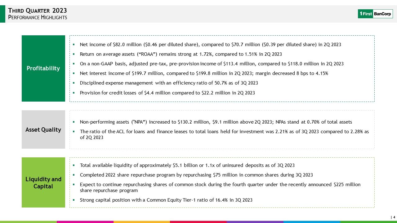 Third Quarter 2023Performance Highlights  Profitability  Net income of $82.0 million ($0.46 per diluted share), compared to $70.7 million ($0.39 per diluted share) in 2Q 2023  Return on average assets (“ROAA”) remains strong at 1.72%, compared to 1.51% in 2Q 2023  On a non-GAAP basis, adjusted pre-tax, pre-provision income of $113.4 million, compared to $118.0 million in 2Q 2023  Net interest income of $199.7 million, compared to $199.8 million in 2Q 2023; margin decreased 8 bps to 4.15%  Disciplined expense management with an efficiency ratio of 50.7% as of 3Q 2023  Provision for credit losses of $4.4 million compared to $22.2 million in 2Q 2023  Non-performing assets ("NPA”) increased to $130.2 million, $9.1 million above 2Q 2023; NPAs stand at 0.70% of total assets  The ratio of the ACL for loans and finance leases to total loans held for investment was 2.21% as of 3Q 2023 compared to 2.28% as of 2Q 2023  Asset Quality  Total available liquidity of approximately $5.1 billion or 1.1x of uninsured deposits as of 3Q 2023  Completed 2022 share repurchase program by repurchasing $75 million in common shares during 3Q 2023  Expect to continue repurchasing shares of common stock during the fourth quarter under the recently announced $225 million share repurchase program  Strong capital position with a Common Equity Tier-1 ratio of 16.4% in 3Q 2023  Liquidity and Capital
