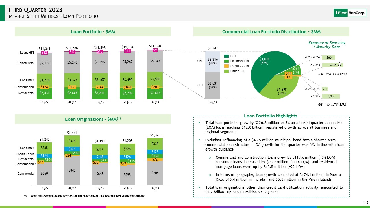 Third Quarter 2023 balance Sheet Metrics – Loan Portfolio  Loan Portfolio - $MM  Loan Originations - $MM(1)  $12  $124  3Q22  $12  $133  4Q22  $15  $144  1Q23  $14  $164  2Q23  $9  $203  3Q23  Loans HFS  Commercial  Consumer  Construction  Residential  $11,311  $11,566  $11,593  $11,734  $11,960  $22  3Q22  $24  4Q22  $77  $36  1Q23  $47  2Q23  $72  3Q23  Consumer  Credit Cards  Residential  Construction  Commercial  $1,245  $1,441  $1,193  $1,209  $1,370  Loan Originations include refinancing and renewals, as well as credit card utilization activity   Commercial Loan Portfolio Distribution - $MM  $2,316(43%)  $3,031(57%)  3Q23  CRE  C&I  $5,347  $3,031(57%)  $374(7%)  $44(1%)  $1,898(36%)  C&I  PR Office CRE  US Office CRE  Other CRE  2023-2024  $308  > 2025  Total loan portfolio grew by $226.3 million or 8% on a linked-quarter annualized (LQA) basis reaching $12.0 billion; registered growth across all business and regional segments  Excluding refinancing of a $46.5 million municipal bond into a shorter-term commercial loan structure, LQA growth for the quarter was 6%, in line with loan growth guidance  Commercial and construction loans grew by $119.6 million (+9% LQA), consumer loans increased by $93.2 million (+11% LQA), and residential mortgage loans were up by $13.5 million (+2% LQA)  In terms of geography, loan growth consisted of $174.1 million in Puerto Rico, $46.4 million in Florida, and $5.8 million in the Virgin Islands  Total loan originations, other than credit card utilization activity, amounted to $1.2 billion, up $163.1 million vs. 2Q 2023  Loan Portfolio Highlights  Exposure at Repricing / Maturity Date  2023-2024  > 2025  (US – WA. LTV: 53%)  (PR – WA. LTV: 65%)