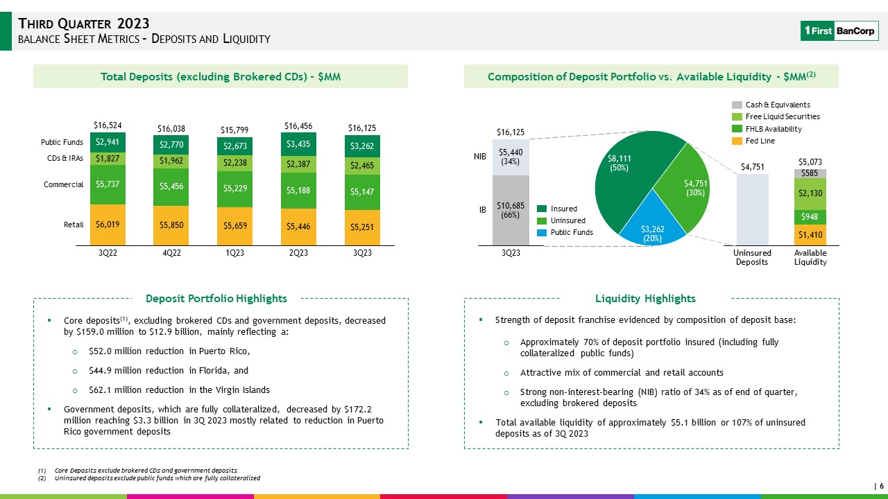 Third Quarter 2023 balance Sheet Metrics – Deposits and Liquidity  Core Deposits exclude brokered CDs and government deposits  Uninsured deposits exclude public funds which are fully collateralized  Total Deposits (excluding Brokered CDs) - $MM  3Q22  4Q22  1Q23  2Q23  3Q23  Public Funds  CDs & IRAs  Commercial  Retail  $16,524  $16,038  $15,799  $16,456  $16,125  Core deposits(1), excluding brokered CDs and government deposits, decreased by $159.0 million to $12.9 billion, mainly reflecting a:   $52.0 million reduction in Puerto Rico,   $44.9 million reduction in Florida, and  $62.1 million reduction in the Virgin Islands  Government deposits, which are fully collateralized, decreased by $172.2 million reaching $3.3 billion in 3Q 2023 mostly related to reduction in Puerto Rico government deposits  Deposit Portfolio Highlights  Composition of Deposit Portfolio vs. Available Liquidity - $MM(2)  $5,440(34%)  $10,685(66%)  3Q23  NIB  IB  $16,125  $8,111(50%)  $4,751(30%)  $3,262(20%)  Insured  Uninsured  Public Funds  Uninsured Deposits  Available Liquidity  $5,073  Cash & Equivalents  Free Liquid Securities  FHLB Availability  Fed Line  Strength of deposit franchise evidenced by composition of deposit base:  Approximately 70% of deposit portfolio insured (including fully collateralized public funds)  Attractive mix of commercial and retail accounts  Strong non-interest-bearing (NIB) ratio of 34% as of end of quarter, excluding brokered deposits  Total available liquidity of approximately $5.1 billion or 107% of uninsured deposits as of 3Q 2023  Liquidity Highlights