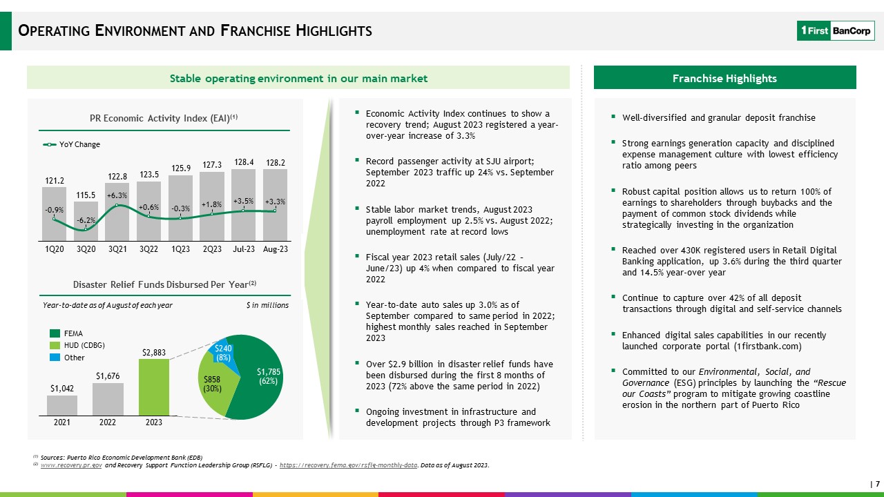 Operating Environment and Franchise Highlights  Stable operating environment in our main market  1Q20  3Q20  3Q21  3Q22  1Q23  2Q23  Jul-23  Aug-23  -6.2%  YoY Change  PR Economic Activity Index (EAI)(1)  Disaster Relief Funds Disbursed Per Year(2)  (1) Sources: Puerto Rico Economic Development Bank (EDB)  (2) www.recovery.pr.gov and Recovery Support Function Leadership Group (RSFLG) - https://recovery.fema.gov/rsflg-monthly-data. Data as of August 2023.  2021  2022  2023  $1,042  $1,676  $2,883  $1,785(62%)  $858(30%)  $240(8%)  FEMA  HUD (CDBG)  Other  $ in millions  Franchise Highlights  Year-to-date as of August of each year  Economic Activity Index continues to show a recovery trend; August 2023 registered a year-over-year increase of 3.3%  Record passenger activity at SJU airport; September 2023 traffic up 24% vs. September 2022  Stable labor market trends, August 2023 payroll employment up 2.5% vs. August 2022; unemployment rate at record lows  Fiscal year 2023 retail sales (July/22 – June/23) up 4% when compared to fiscal year 2022  Year-to-date auto sales up 3.0% as of September compared to same period in 2022; highest monthly sales reached in September 2023  Over $2.9 billion in disaster relief funds have been disbursed during the first 8 months of 2023 (72% above the same period in 2022)  Ongoing investment in infrastructure and development projects through P3 framework  Well-diversified and granular deposit franchise   Strong earnings generation capacity and disciplined expense management culture with lowest efficiency ratio among peers  Robust capital position allows us to return 100% of earnings to shareholders through buybacks and the payment of common stock dividends while strategically investing in the organization  Reached over 430K registered users in Retail Digital Banking application, up 3.6% during the third quarter and 14.5% year-over year  Continue to capture over 42% of all deposit transactions through digital and self-service channels  Enhanced digital sales capabilities in our recently launched corporate portal (1firstbank.com)  Committed to our Environmental, Social, and Governance (ESG) principles by launching the “Rescue our Coasts” program to mitigate growing coastline erosion in the northern part of Puerto Rico