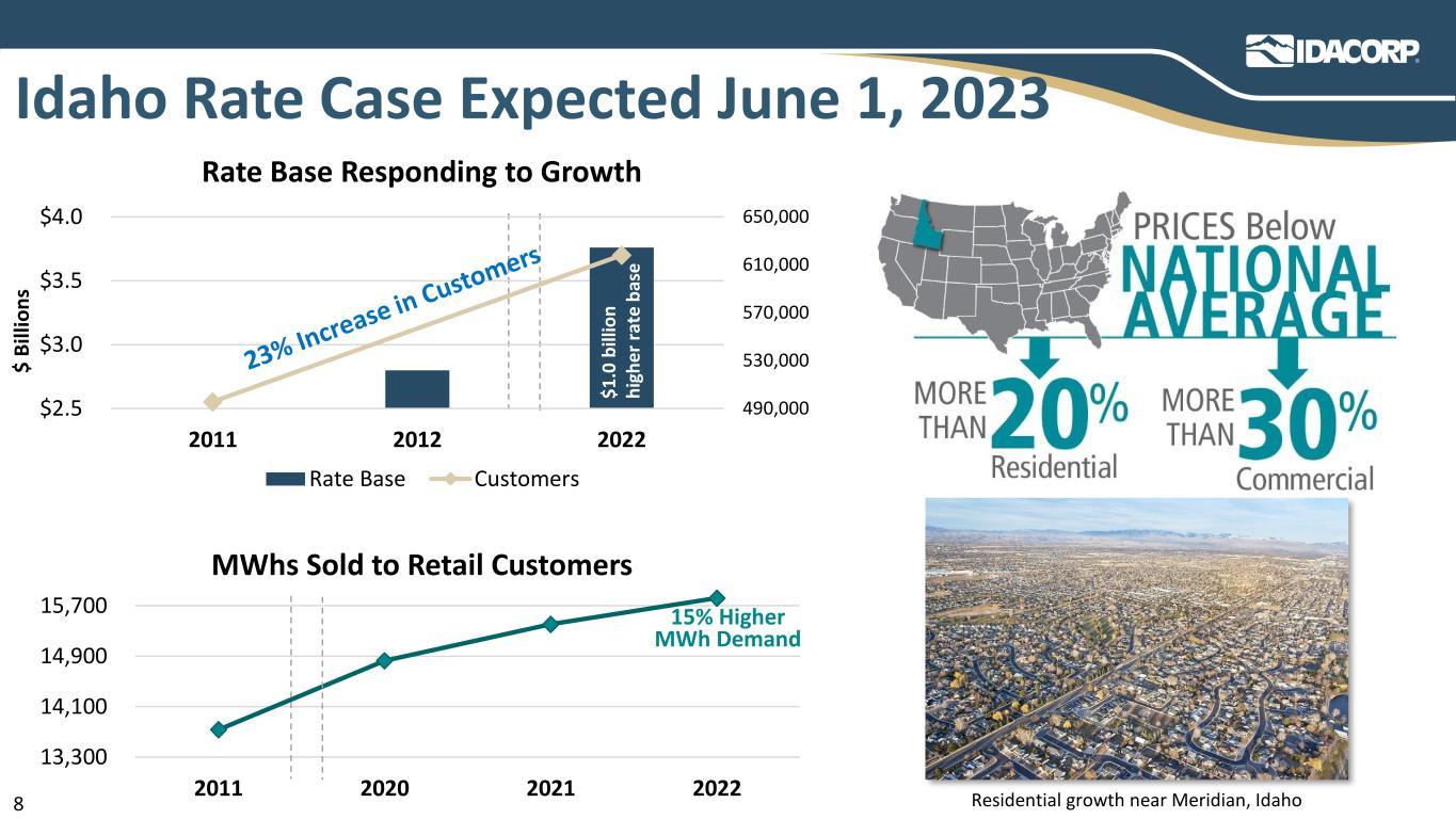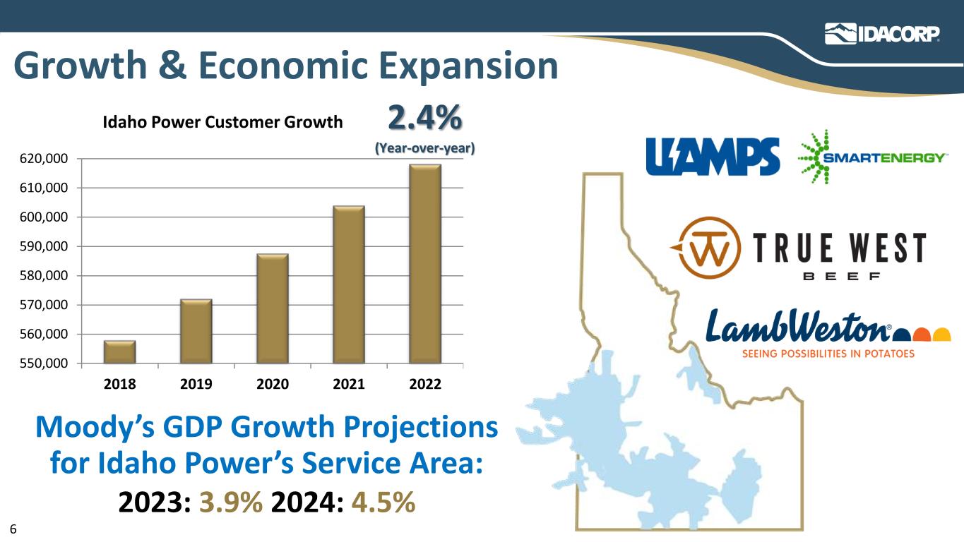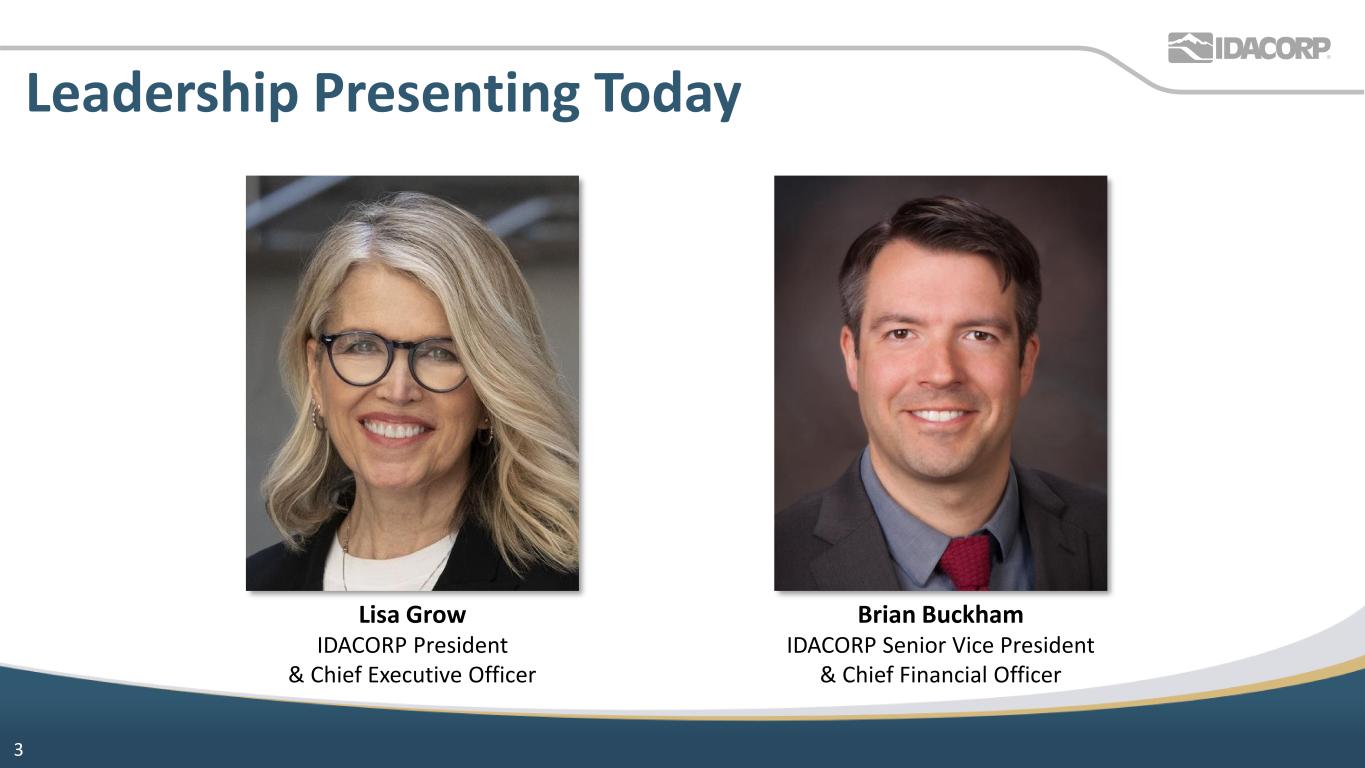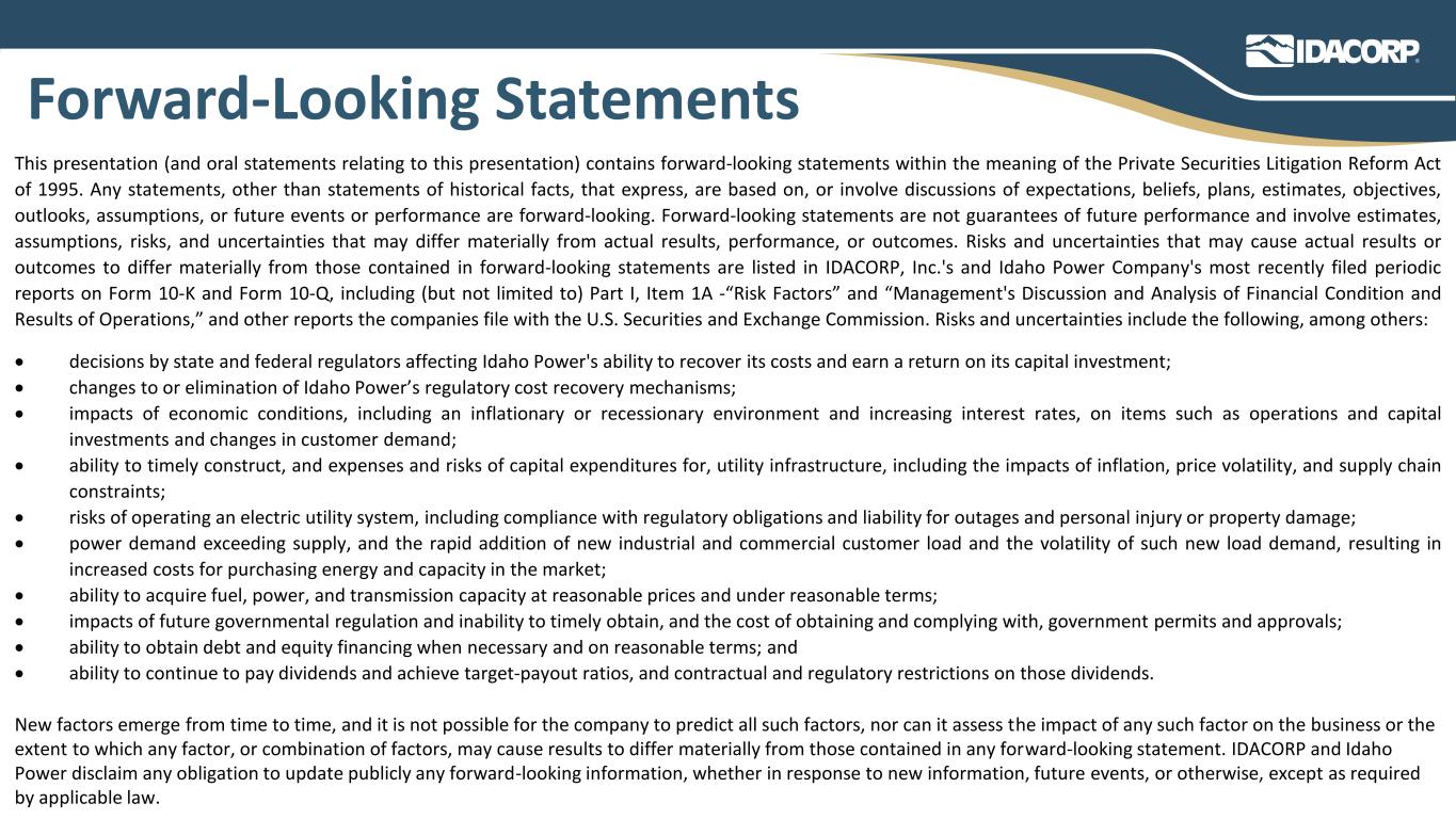 Forward-Looking Statements This presentation (and oral statements relating to this presentation) contains forward-looking statements within the meaning of the Private Securities Litigation Reform Act of 1995. Any statements, other than statements of historical facts, that express, are based on, or involve discussions of expectations, beliefs, plans, estimates, objectives, outlooks, assumptions, or future events or performance are forward-looking. Forward-looking statements are not guarantees of future performance and involve estimates, assumptions, risks, and uncertainties that may differ materially from actual results, performance, or outcomes. Risks and uncertainties that may cause actual results or outcomes to differ materially from those contained in forward-looking statements are listed in IDACORP, Inc.'s and Idaho Power Company's most recently filed periodic reports on Form 10-K and Form 10-Q, including (but not limited to) Part I, Item 1A -“Risk Factors” and “Management's Discussion and Analysis of Financial Condition and Results of Operations,” and other reports the companies file with the U.S. Securities and Exchange Commission. Risks and uncertainties include the following, among others: • decisions by state and federal regulators affecting Idaho Power's ability to recover its costs and earn a return on its capital investment; • changes to or elimination of Idaho Power’s regulatory cost recovery mechanisms; • impacts of economic conditions, including an inflationary or recessionary environment and increasing interest rates, on items such as operations and capital investments and changes in customer demand; • ability to timely construct, and expenses and risks of capital expenditures for, utility infrastructure, including the impacts of inflation, price volatility, and supply chain constraints; • risks of operating an electric utility system, including compliance with regulatory obligations and liability for outages and personal injury or property damage; • power demand exceeding supply, and the rapid addition of new industrial and commercial customer load and the volatility of such new load demand, resulting in increased costs for purchasing energy and capacity in the market; • ability to acquire fuel, power, and transmission capacity at reasonable prices and under reasonable terms; • impacts of future governmental regulation and inability to timely obtain, and the cost of obtaining and complying with, government permits and approvals; • ability to obtain debt and equity financing when necessary and on reasonable terms; and • ability to continue to pay dividends and achieve target-payout ratios, and contractual and regulatory restrictions on those dividends. New factors emerge from time to time, and it is not possible for the company to predict all such factors, nor can it assess the impact of any such factor on the business or the extent to which any factor, or combination of factors, may cause results to differ materially from those contained in any forward-looking statement. IDACORP and Idaho Power disclaim any obligation to update publicly any forward-looking information, whether in response to new information, future events, or otherwise, except as required by applicable law.