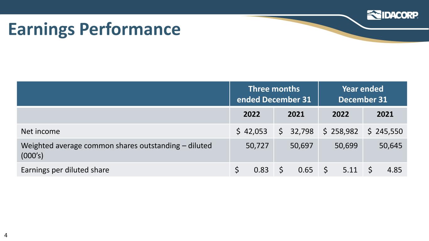 Earnings Performance Three months ended December 31 Year ended December 31 2022 2021 2022 2021 Net income $ 42,053 $ 32,798 $ 258,982 $ 245,550 Weighted average common shares outstanding – diluted (000’s) 50,727 50,697 50,699 50,645 Earnings per diluted share $ 0.83 $ 0.65 $ 5.11 $ 4.85 4