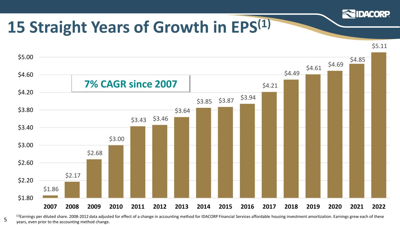 15 Straight Years of Growth in EPS(1) $1.86 $2.17 $2.68 $3.00 $3.43 $3.46 $3.64 $3.85 $3.87 $3.94 $4.21 $4.49 $4.61 $4.69 $4.85 $5.11 $1.80 $2.20 $2.60 $3.00 $3.40 $3.80 $4.20 $4.60 $5.00 2007 2008 2009 2010 2011 2012 2013 2014 2015 2016 2017 2018 2019 2020 2021 2022 (1)Earnings per diluted share. 2008-2012 data adjusted for effect of a change in accounting method for IDACORP Financial Services affordable housing investment amortization. Earnings grew each of these years, even prior to the accounting method change. 7% CAGR since 2007 5