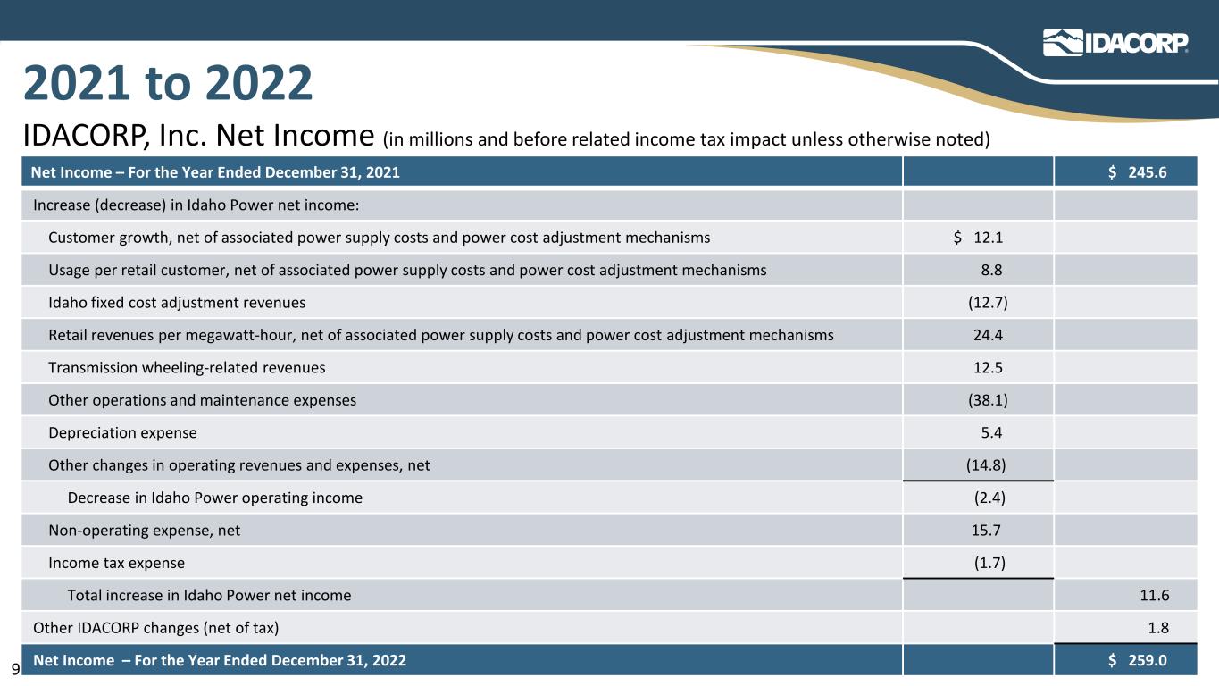 2021 to 2022 IDACORP, Inc. Net Income (in millions and before related income tax impact unless otherwise noted) 9 Net Income – For the Year Ended December 31, 2021 $ 245.6 Increase (decrease) in Idaho Power net income: Customer growth, net of associated power supply costs and power cost adjustment mechanisms $ 12.1 Usage per retail customer, net of associated power supply costs and power cost adjustment mechanisms 8.8 Idaho fixed cost adjustment revenues (12.7) Retail revenues per megawatt-hour, net of associated power supply costs and power cost adjustment mechanisms 24.4 Transmission wheeling-related revenues 12.5 Other operations and maintenance expenses (38.1) Depreciation expense 5.4 Other changes in operating revenues and expenses, net (14.8) Decrease in Idaho Power operating income (2.4) Non-operating expense, net 15.7 Income tax expense (1.7) Total increase in Idaho Power net income 11.6 Other IDACORP changes (net of tax) 1.8 Net Income – For the Year Ended December 31, 2022 $ 259.0