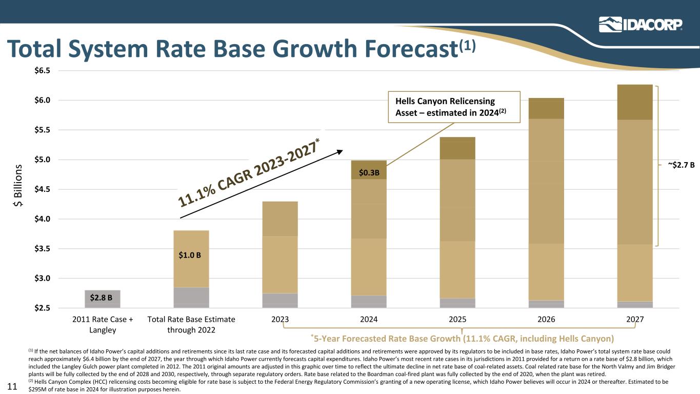 Capital Expenditures Forecast(1) 2023 – 2027 ($ Millions) $0 $100 $200 $300 $400 $500 $600 $700 $800 $900 2023 2024 2025 2026 2027 Distribution ($125-$170M) Hydro ($80-$130M) Transmission ($50-$150M) General Plant ($50-$80M) Thermal ($10-$50M) High Voltage Transmission ($40-$180M) New capacity resources ($10-$210M) (1) As of February 16, 2023. See page 56 of IDACORP’s 2022 Form 10-K for a summary of project types included in the 5-year forecast. 15% increase from previous 5-year forecast. Potential to further increase, depending on announced large load projects 10 $650M per year average ~$330M per year average previous 5 years
