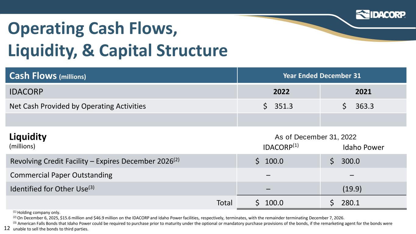 IDACORP(1) Idaho Power Revolving Credit Facility – Expires December 2026(2) $ 100.0 $ 300.0 Commercial Paper Outstanding – – Identified for Other Use(3) – (19.9) Total $ 100.0 $ 280.1 Operating Cash Flows, Liquidity, & Capital Structure 9 Cash Flows (millions) Year Ended December 31 IDACORP 2022 2021 Net Cash Provided by Operating Activities $ 351.3 $ 363.3 Liquidity (millions) 12 As of December 31, 2022 (1) Holding company only. (2) On December 6, 2025, $15.6 million and $46.9 million on the IDACORP and Idaho Power facilities, respectively, terminates, with the remainder terminating December 7, 2026. (3) American Falls Bonds that Idaho Power could be required to purchase prior to maturity under the optional or mandatory purchase provisions of the bonds, if the remarketing agent for the bonds were unable to sell the bonds to third parties.