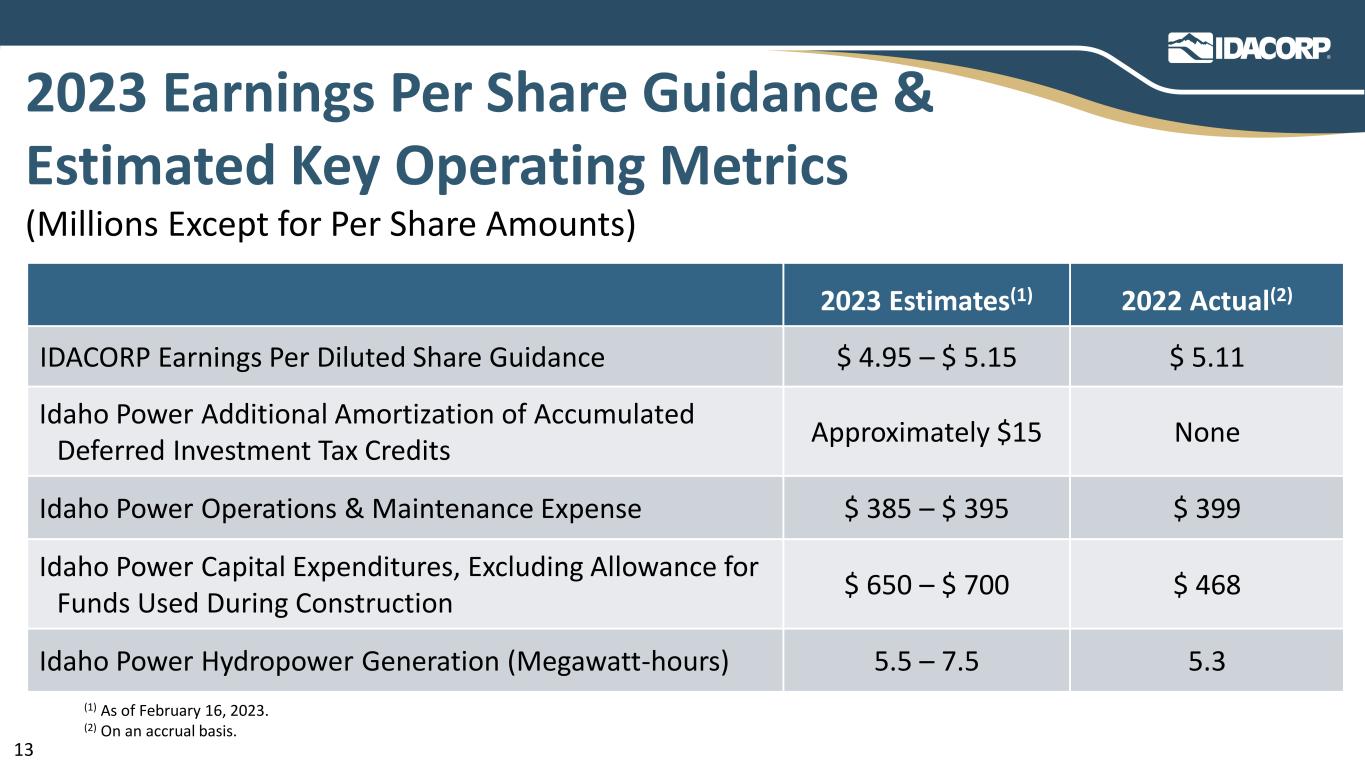 2023 Earnings Per Share Guidance & Estimated Key Operating Metrics (Millions Except for Per Share Amounts) 2023 Estimates(1) 2022 Actual(2) IDACORP Earnings Per Diluted Share Guidance $ 4.95 – $ 5.15 $ 5.11 Idaho Power Additional Amortization of Accumulated Deferred Investment Tax Credits Approximately $15 None Idaho Power Operations & Maintenance Expense $ 385 – $ 395 $ 399 Idaho Power Capital Expenditures, Excluding Allowance for Funds Used During Construction $ 650 – $ 700 $ 468 Idaho Power Hydropower Generation (Megawatt-hours) 5.5 – 7.5 5.3 (1) As of February 16, 2023. (2) On an accrual basis. 13