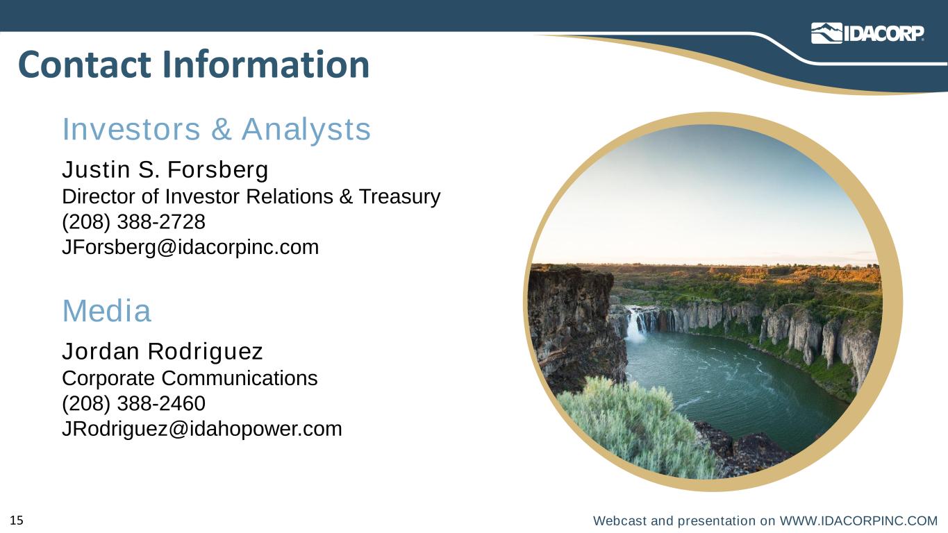 Contact Information Justin S. Forsberg Director of Investor Relations & Treasury (208) 388-2728 JForsberg@idacorpinc.com Investors & Analysts Jordan Rodriguez Corporate Communications (208) 388-2460 JRodriguez@idahopower.com Media Webcast and presentation on WWW.IDACORPINC.COM15