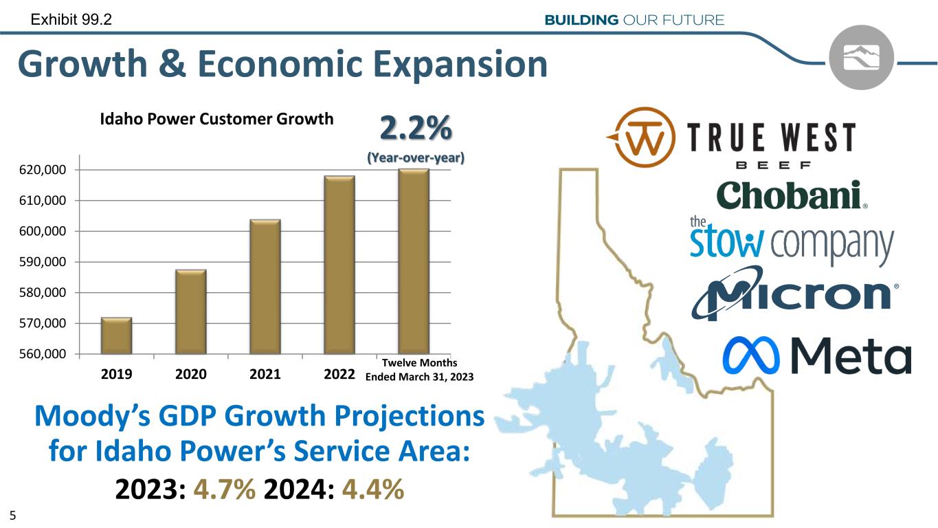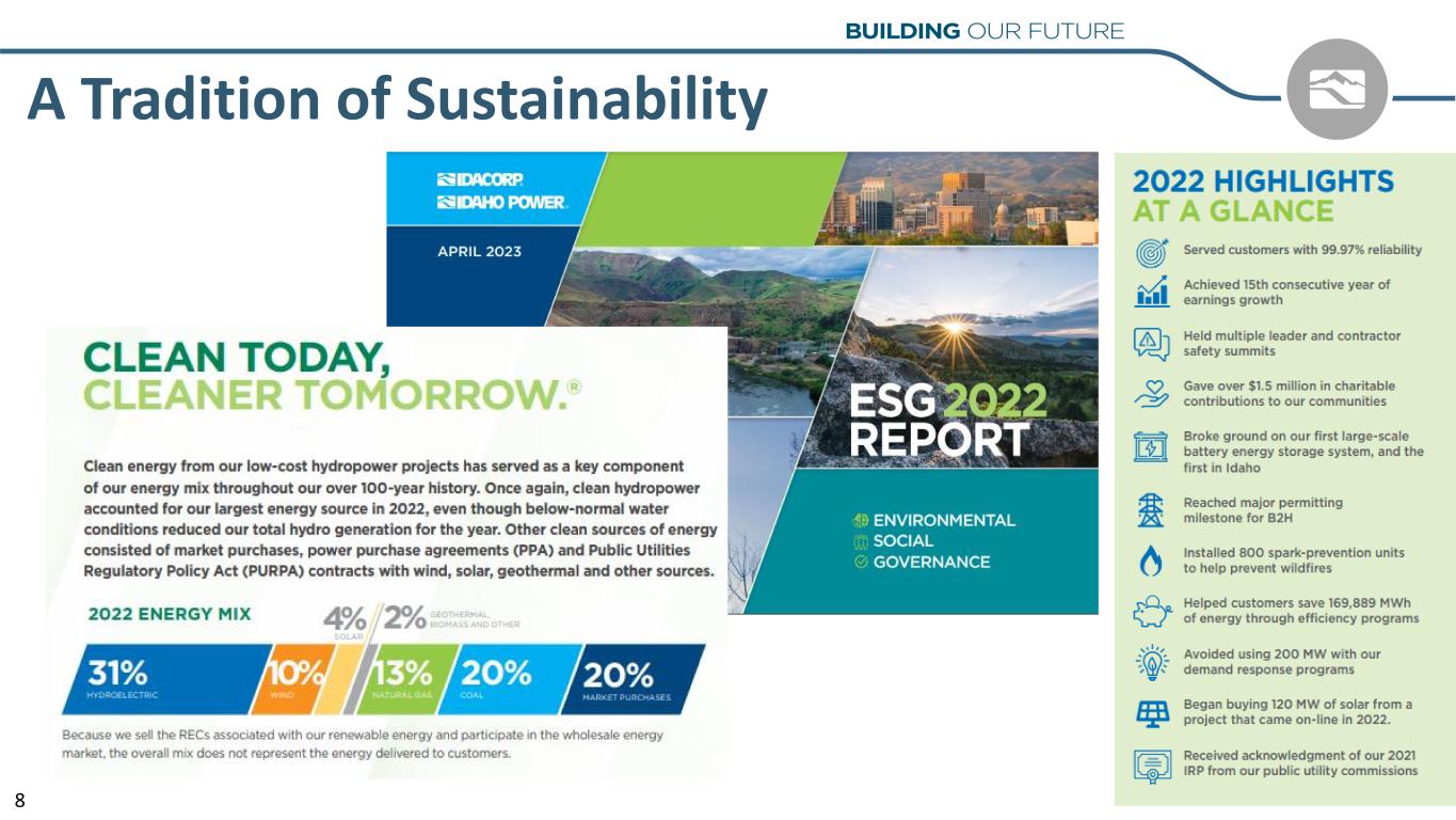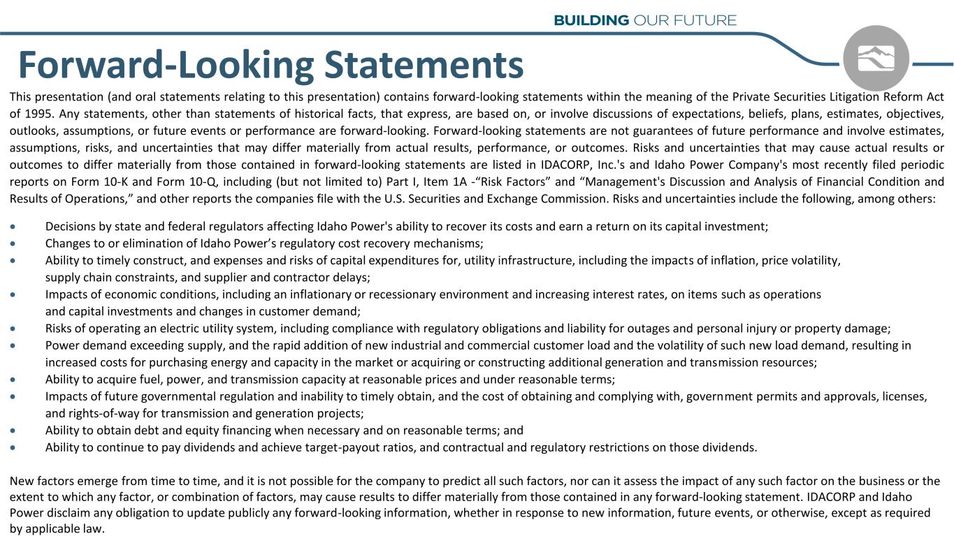 Forward-Looking Statements This presentation (and oral statements relating to this presentation) contains forward-looking statements within the meaning of the Private Securities Litigation Reform Act of 1995. Any statements, other than statements of historical facts, that express, are based on, or involve discussions of expectations, beliefs, plans, estimates, objectives, outlooks, assumptions, or future events or performance are forward-looking. Forward-looking statements are not guarantees of future performance and involve estimates, assumptions, risks, and uncertainties that may differ materially from actual results, performance, or outcomes. Risks and uncertainties that may cause actual results or outcomes to differ materially from those contained in forward-looking statements are listed in IDACORP, Inc.'s and Idaho Power Company's most recently filed periodic reports on Form 10-K and Form 10-Q, including (but not limited to) Part I, Item 1A -“Risk Factors” and “Management's Discussion and Analysis of Financial Condition and Results of Operations,” and other reports the companies file with the U.S. Securities and Exchange Commission. Risks and uncertainties include the following, among others: • Decisions by state and federal regulators affecting Idaho Power's ability to recover its costs and earn a return on its capital investment; • Changes to or elimination of Idaho Power’s regulatory cost recovery mechanisms; • Ability to timely construct, and expenses and risks of capital expenditures for, utility infrastructure, including the impacts of inflation, price volatility, supply chain constraints, and supplier and contractor delays; • Impacts of economic conditions, including an inflationary or recessionary environment and increasing interest rates, on items such as operations and capital investments and changes in customer demand; • Risks of operating an electric utility system, including compliance with regulatory obligations and liability for outages and personal injury or property damage; • Power demand exceeding supply, and the rapid addition of new industrial and commercial customer load and the volatility of such new load demand, resulting in increased costs for purchasing energy and capacity in the market or acquiring or constructing additional generation and transmission resources; • Ability to acquire fuel, power, and transmission capacity at reasonable prices and under reasonable terms; • Impacts of future governmental regulation and inability to timely obtain, and the cost of obtaining and complying with, government permits and approvals, licenses, and rights-of-way for transmission and generation projects; • Ability to obtain debt and equity financing when necessary and on reasonable terms; and • Ability to continue to pay dividends and achieve target-payout ratios, and contractual and regulatory restrictions on those dividends. New factors emerge from time to time, and it is not possible for the company to predict all such factors, nor can it assess the impact of any such factor on the business or the extent to which any factor, or combination of factors, may cause results to differ materially from those contained in any forward-looking statement. IDACORP and Idaho Power disclaim any obligation to update publicly any forward-looking information, whether in response to new information, future events, or otherwise, except as required by applicable law.