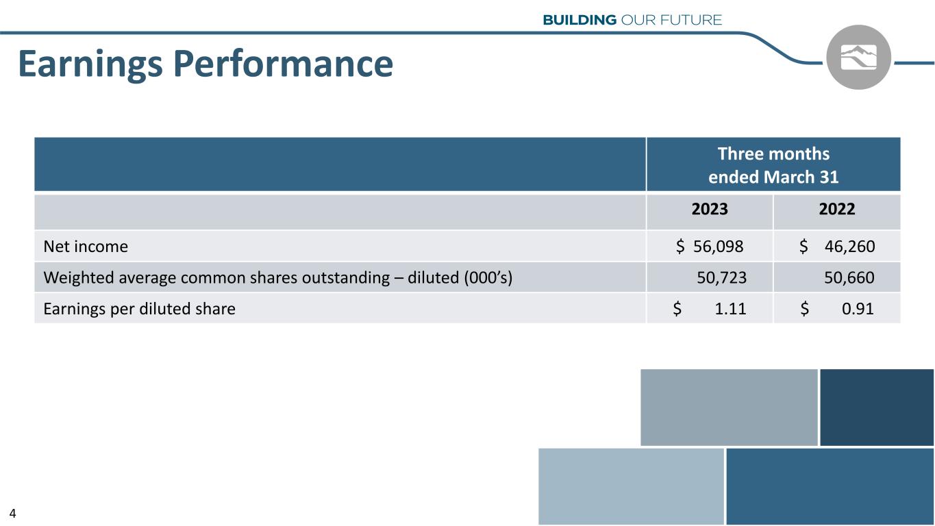 Earnings Performance Three months ended March 31 2023 2022 Net income $ 56,098 $ 46,260 Weighted average common shares outstanding – diluted (000’s) 50,723 50,660 Earnings per diluted share $ 1.11 $ 0.91 4