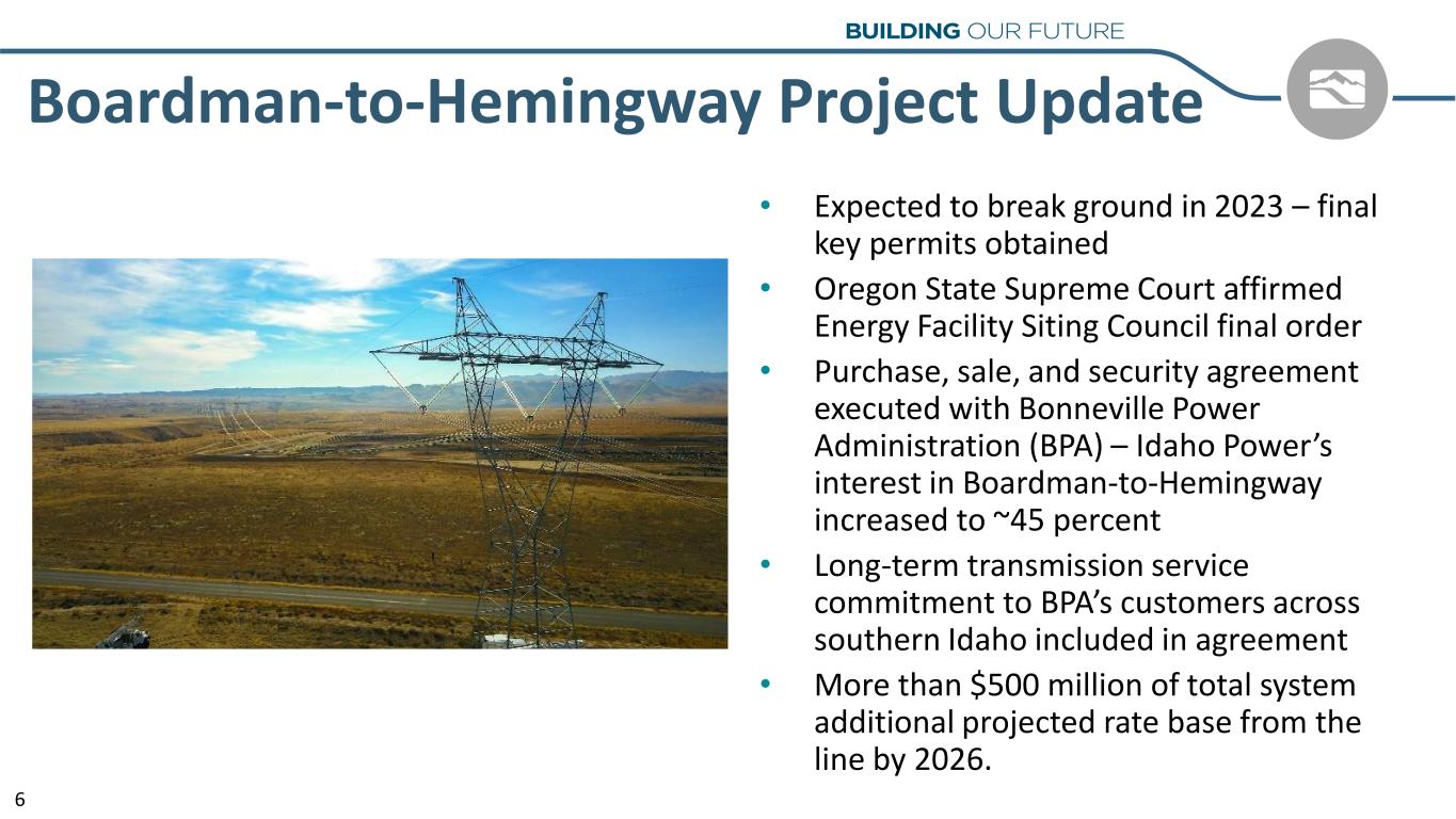 Growth & Economic Expansion Moody’s GDP Growth Projections for Idaho Power’s Service Area: 2023: 4.7% 2024: 4.4% 5 2.2% (Year-over-year) Idaho Power Customer Growth 560,000 570,000 580,000 590,000 600,000 610,000 620,000 2019 2020 2021 2022 Twelve Months Ended March 31, 2023 Exhibit 99.2