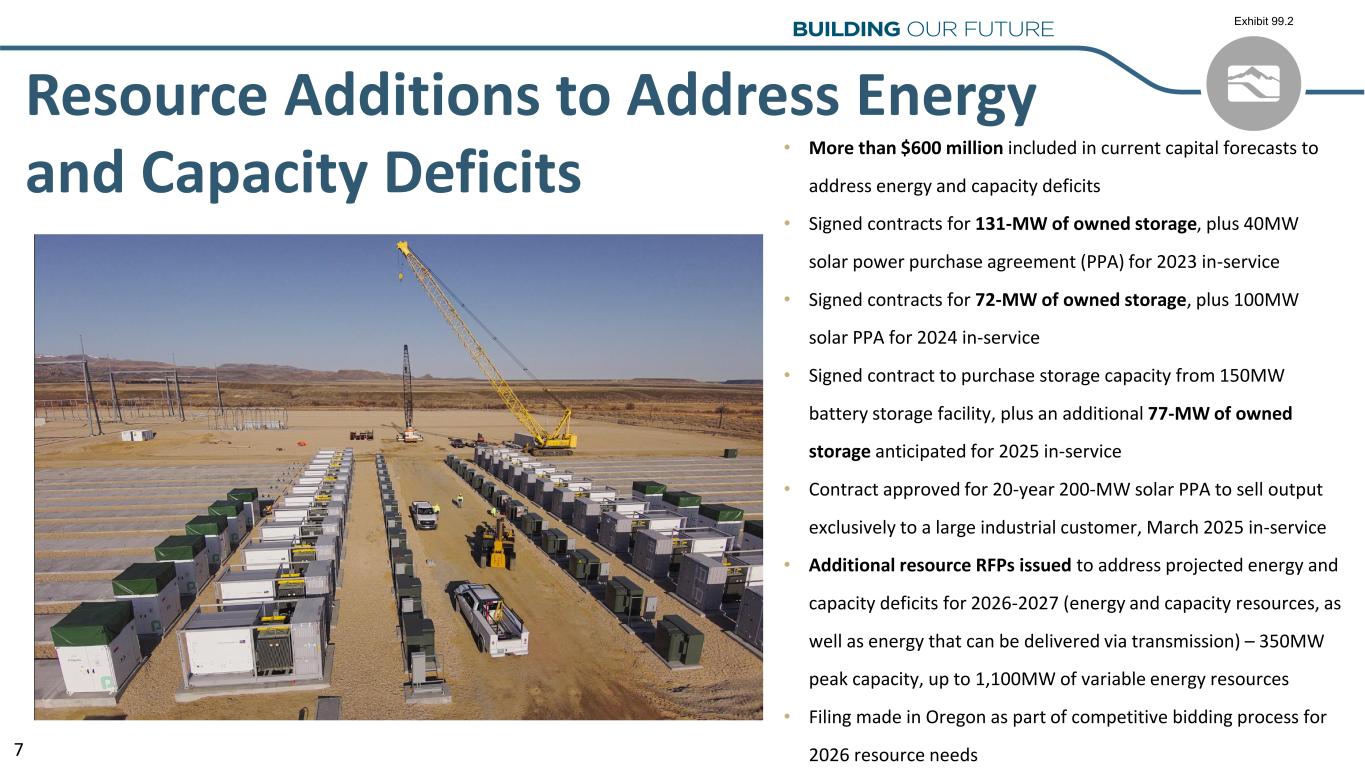 Boardman-to-Hemingway Project Update • Expected to break ground in 2023 – final key permits obtained • Oregon State Supreme Court affirmed Energy Facility Siting Council final order • Purchase, sale, and security agreement executed with Bonneville Power Administration (BPA) – Idaho Power’s interest in Boardman-to-Hemingway increased to ~45 percent • Long-term transmission service commitment to BPA’s customers across southern Idaho included in agreement • More than $500 million of total system additional projected rate base from the line by 2026. 6