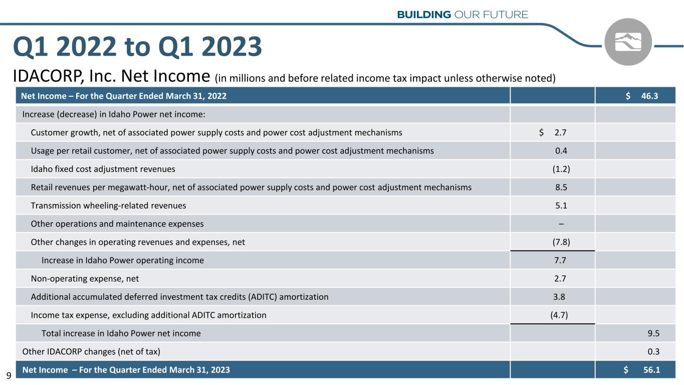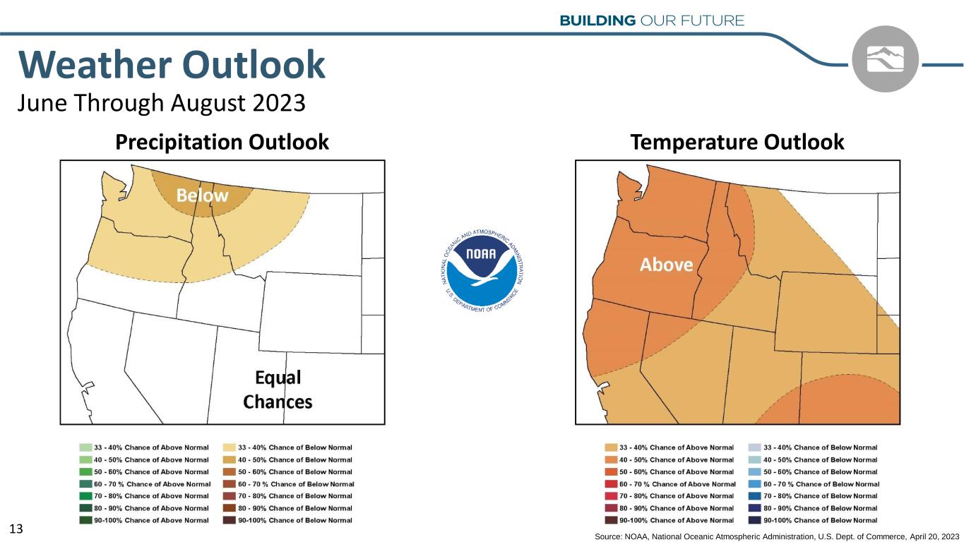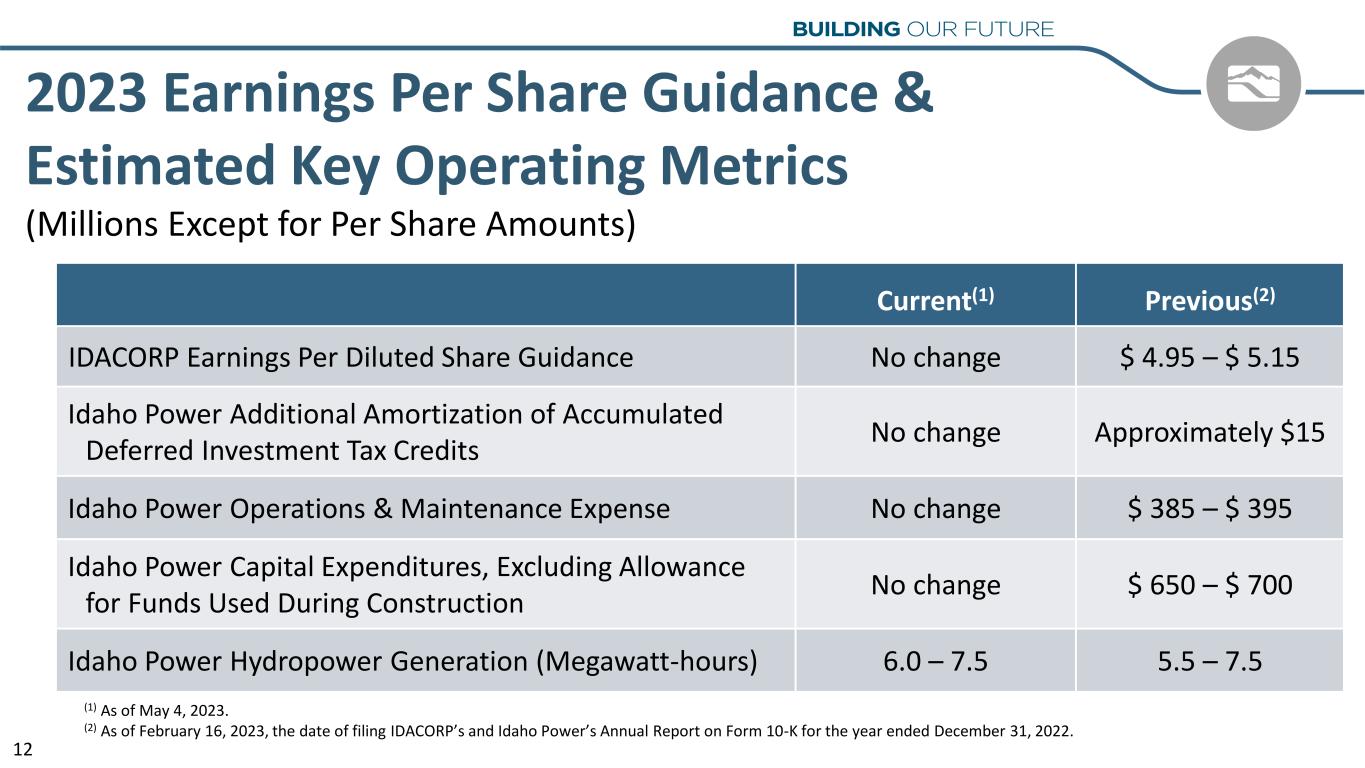 2023 Earnings Per Share Guidance & Estimated Key Operating Metrics (Millions Except for Per Share Amounts) Current(1) Previous(2) IDACORP Earnings Per Diluted Share Guidance No change $ 4.95 – $ 5.15 Idaho Power Additional Amortization of Accumulated Deferred Investment Tax Credits No change Approximately $15 Idaho Power Operations & Maintenance Expense No change $ 385 – $ 395 Idaho Power Capital Expenditures, Excluding Allowance for Funds Used During Construction No change $ 650 – $ 700 Idaho Power Hydropower Generation (Megawatt-hours) 6.0 – 7.5 5.5 – 7.5 (1) As of May 4, 2023. (2) As of February 16, 2023, the date of filing IDACORP’s and Idaho Power’s Annual Report on Form 10-K for the year ended December 31, 2022. 12