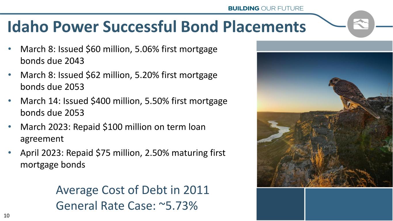 • March 8: Issued $60 million, 5.06% first mortgage bonds due 2043 • March 8: Issued $62 million, 5.20% first mortgage bonds due 2053 • March 14: Issued $400 million, 5.50% first mortgage bonds due 2053 • March 2023: Repaid $100 million on term loan agreement • April 2023: Repaid $75 million, 2.50% maturing first mortgage bonds Idaho Power Successful Bond Placements Average Cost of Debt in 2011 General Rate Case: ~5.73% 10