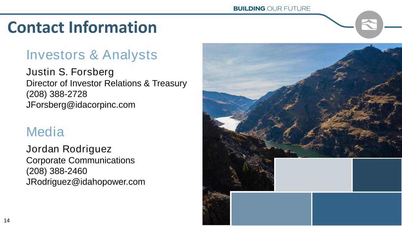 Contact Information Justin S. Forsberg Director of Investor Relations & Treasury (208) 388-2728 JForsberg@idacorpinc.com Investors & Analysts Jordan Rodriguez Corporate Communications (208) 388-2460 JRodriguez@idahopower.com Media 14