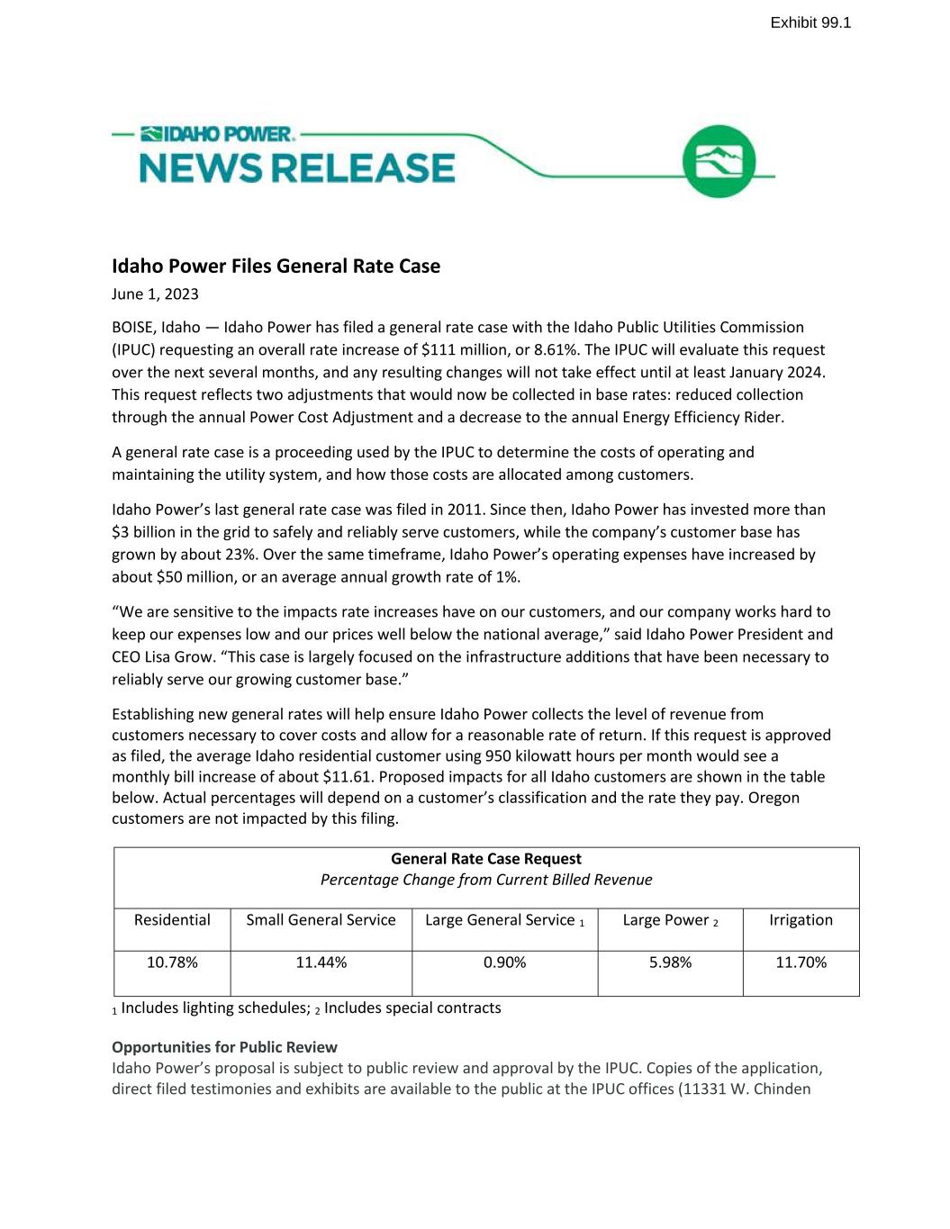 Idaho Power Files General Rate Case June 1, 2023 BOISE, Idaho — Idaho Power has filed a general rate case with the Idaho Public Utilities Commission (IPUC) requesting an overall rate increase of $111 million, or 8.61%. The IPUC will evaluate this request over the next several months, and any resulting changes will not take effect until at least January 2024. This request reflects two adjustments that would now be collected in base rates: reduced collection through the annual Power Cost Adjustment and a decrease to the annual Energy Efficiency Rider. A general rate case is a proceeding used by the IPUC to determine the costs of operating and maintaining the utility system, and how those costs are allocated among customers. Idaho Power’s last general rate case was filed in 2011. Since then, Idaho Power has invested more than $3 billion in the grid to safely and reliably serve customers, while the company’s customer base has grown by about 23%. Over the same timeframe, Idaho Power’s operating expenses have increased by about $50 million, or an average annual growth rate of 1%. “We are sensitive to the impacts rate increases have on our customers, and our company works hard to keep our expenses low and our prices well below the national average,” said Idaho Power President and CEO Lisa Grow. “This case is largely focused on the infrastructure additions that have been necessary to reliably serve our growing customer base.” Establishing new general rates will help ensure Idaho Power collects the level of revenue from customers necessary to cover costs and allow for a reasonable rate of return. If this request is approved as filed, the average Idaho residential customer using 950 kilowatt hours per month would see a monthly bill increase of about $11.61. Proposed impacts for all Idaho customers are shown in the table below. Actual percentages will depend on a customer’s classification and the rate they pay. Oregon customers are not impacted by this filing. General Rate Case Request Percentage Change from Current Billed Revenue Residential Small General Service Large General Service 1 Large Power 2 Irrigation 10.78% 11.44% 0.90% 5.98% 11.70% 1 Includes lighting schedules; 2 Includes special contracts Opportunities for Public Review Idaho Power’s proposal is subject to public review and approval by the IPUC. Copies of the application, direct filed testimonies and exhibits are available to the public at the IPUC offices (11331 W. Chinden Exhibit 99.1