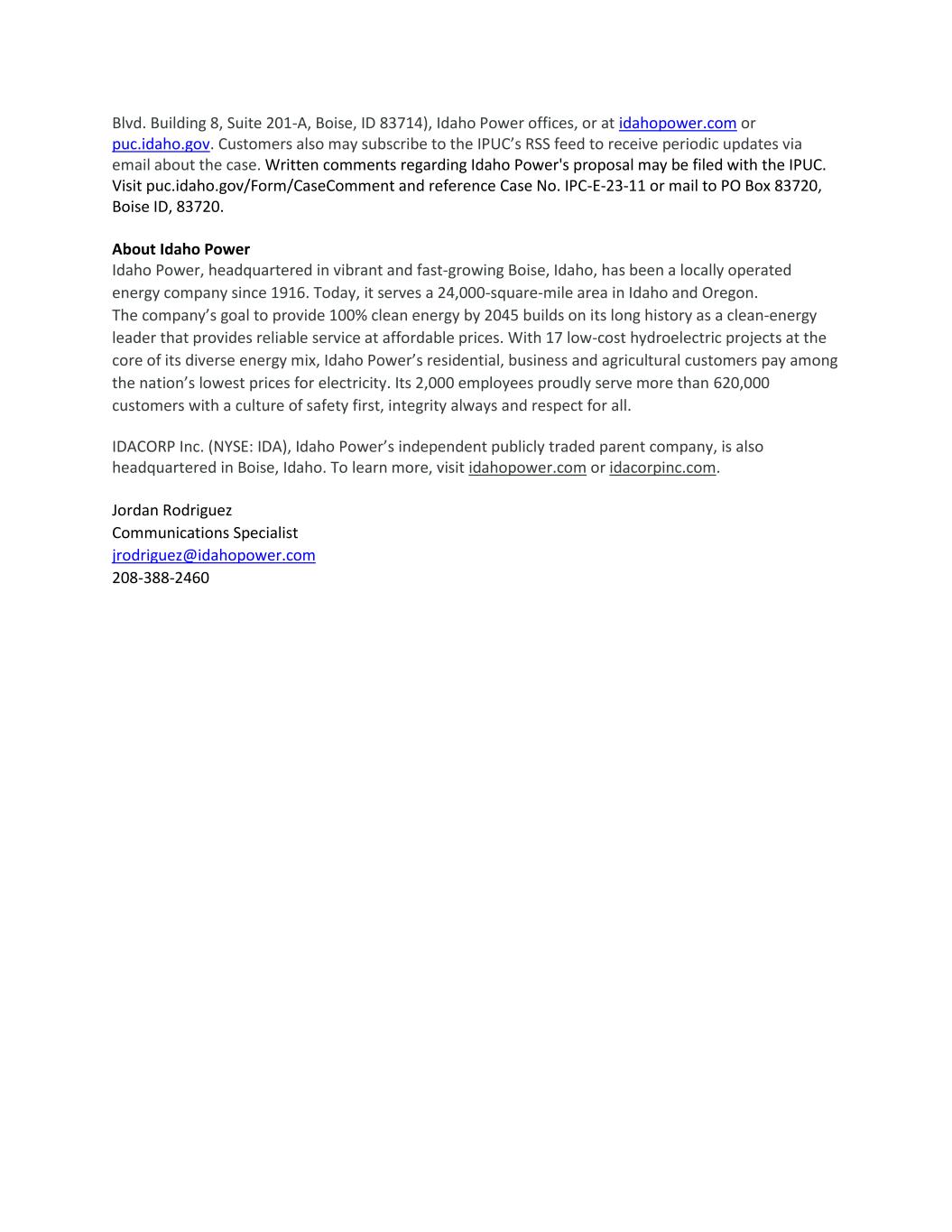 Blvd. Building 8, Suite 201-A, Boise, ID 83714), Idaho Power offices, or at idahopower.com or puc.idaho.gov. Customers also may subscribe to the IPUC’s RSS feed to receive periodic updates via email about the case. Written comments regarding Idaho Power's proposal may be filed with the IPUC. Visit puc.idaho.gov/Form/CaseComment and reference Case No. IPC-E-23-11 or mail to PO Box 83720, Boise ID, 83720. About Idaho Power Idaho Power, headquartered in vibrant and fast-growing Boise, Idaho, has been a locally operated energy company since 1916. Today, it serves a 24,000-square-mile area in Idaho and Oregon. The company’s goal to provide 100% clean energy by 2045 builds on its long history as a clean-energy leader that provides reliable service at affordable prices. With 17 low-cost hydroelectric projects at the core of its diverse energy mix, Idaho Power’s residential, business and agricultural customers pay among the nation’s lowest prices for electricity. Its 2,000 employees proudly serve more than 620,000 customers with a culture of safety first, integrity always and respect for all. IDACORP Inc. (NYSE: IDA), Idaho Power’s independent publicly traded parent company, is also headquartered in Boise, Idaho. To learn more, visit idahopower.com or idacorpinc.com. Jordan Rodriguez Communications Specialist jrodriguez@idahopower.com 208-388-2460