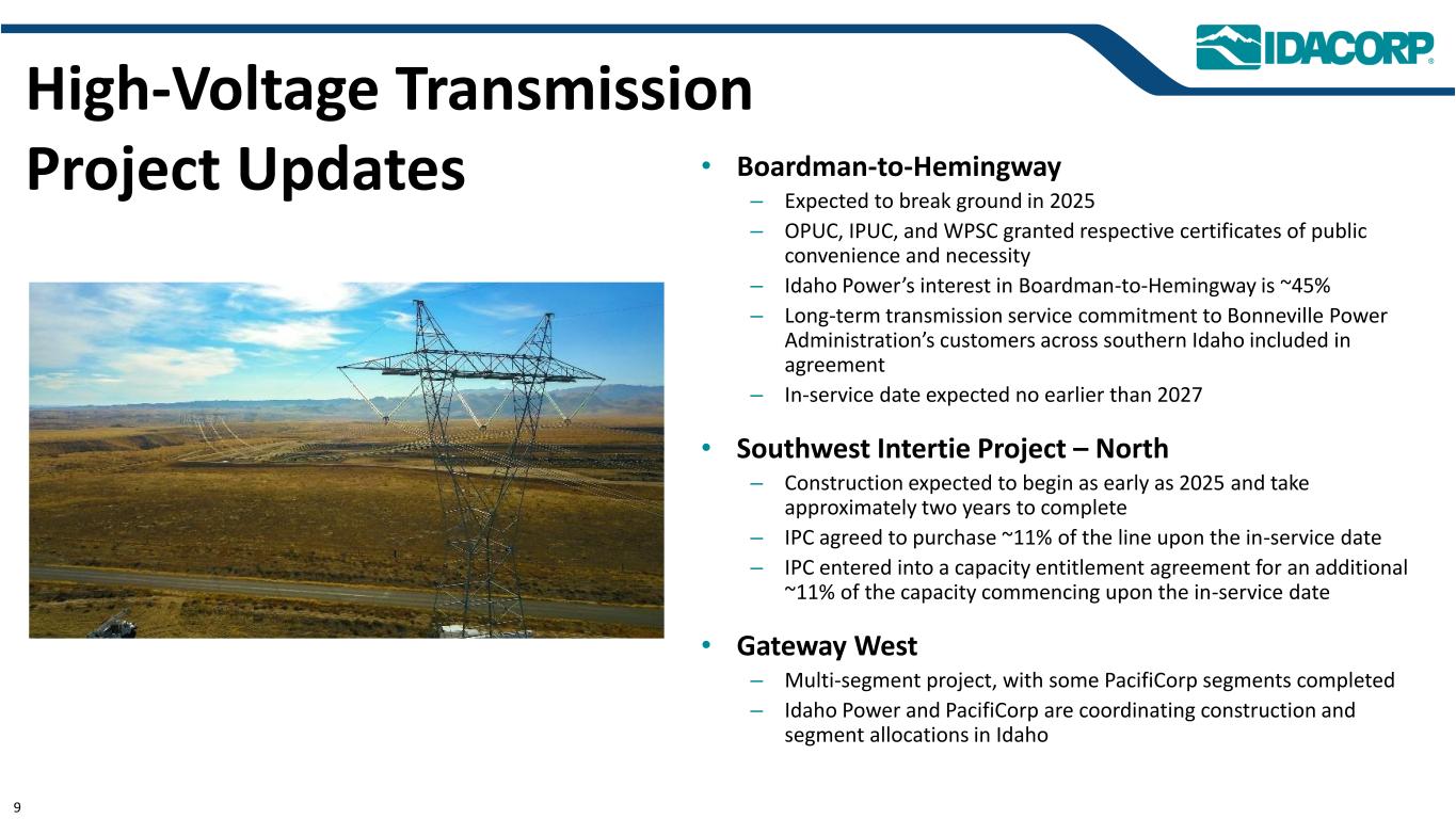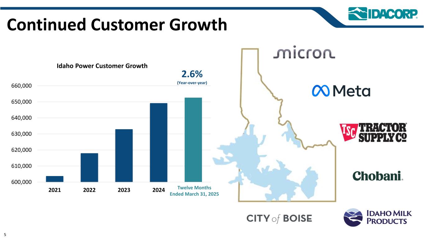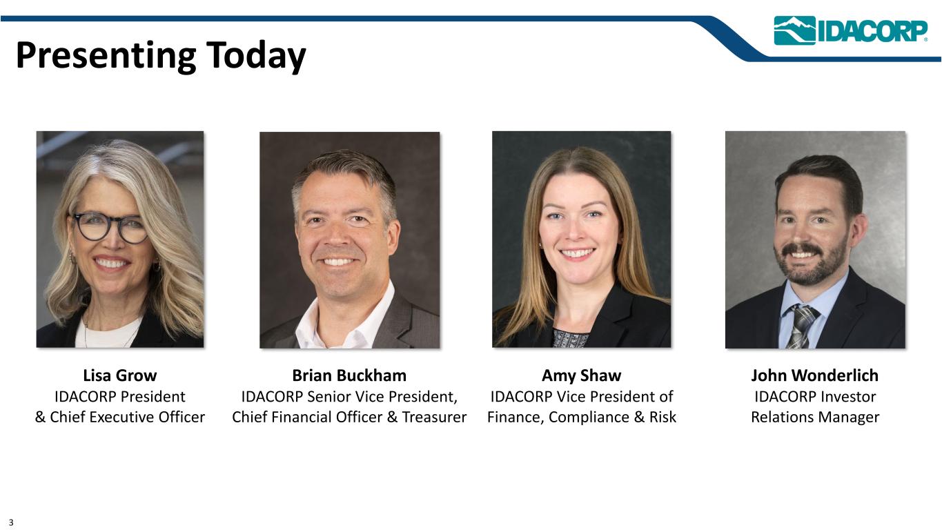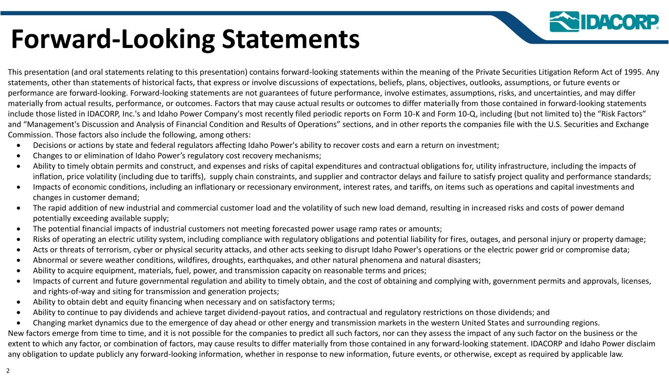 Forward-Looking Statements This presentation (and oral statements relating to this presentation) contains forward-looking statements within the meaning of the Private Securities Litigation Reform Act of 1995. Any statements, other than statements of historical facts, that express or involve discussions of expectations, beliefs, plans, objectives, outlooks, assumptions, or future events or performance are forward-looking. Forward-looking statements are not guarantees of future performance, involve estimates, assumptions, risks, and uncertainties, and may differ materially from actual results, performance, or outcomes. Factors that may cause actual results or outcomes to differ materially from those contained in forward-looking statements include those listed in IDACORP, Inc.'s and Idaho Power Company's most recently filed periodic reports on Form 10-K and Form 10-Q, including (but not limited to) the “Risk Factors” and “Management's Discussion and Analysis of Financial Condition and Results of Operations” sections, and in other reports the companies file with the U.S. Securities and Exchange Commission. Those factors also include the following, among others: • Decisions or actions by state and federal regulators affecting Idaho Power's ability to recover costs and earn a return on investment; • Changes to or elimination of Idaho Power’s regulatory cost recovery mechanisms; • Ability to timely obtain permits and construct, and expenses and risks of capital expenditures and contractual obligations for, utility infrastructure, including the impacts of inflation, price volatility (including due to tariffs), supply chain constraints, and supplier and contractor delays and failure to satisfy project quality and performance standards; • Impacts of economic conditions, including an inflationary or recessionary environment, interest rates, and tariffs, on items such as operations and capital investments and changes in customer demand; • The rapid addition of new industrial and commercial customer load and the volatility of such new load demand, resulting in increased risks and costs of power demand potentially exceeding available supply; • The potential financial impacts of industrial customers not meeting forecasted power usage ramp rates or amounts; • Risks of operating an electric utility system, including compliance with regulatory obligations and potential liability for fires, outages, and personal injury or property damage; • Acts or threats of terrorism, cyber or physical security attacks, and other acts seeking to disrupt Idaho Power's operations or the electric power grid or compromise data; • Abnormal or severe weather conditions, wildfires, droughts, earthquakes, and other natural phenomena and natural disasters; • Ability to acquire equipment, materials, fuel, power, and transmission capacity on reasonable terms and prices; • Impacts of current and future governmental regulation and ability to timely obtain, and the cost of obtaining and complying with, government permits and approvals, licenses, and rights-of-way and siting for transmission and generation projects; • Ability to obtain debt and equity financing when necessary and on satisfactory terms; • Ability to continue to pay dividends and achieve target dividend-payout ratios, and contractual and regulatory restrictions on those dividends; and • Changing market dynamics due to the emergence of day ahead or other energy and transmission markets in the western United States and surrounding regions. New factors emerge from time to time, and it is not possible for the companies to predict all such factors, nor can they assess the impact of any such factor on the business or the extent to which any factor, or combination of factors, may cause results to differ materially from those contained in any forward-looking statement. IDACORP and Idaho Power disclaim any obligation to update publicly any forward-looking information, whether in response to new information, future events, or otherwise, except as required by applicable law. 2