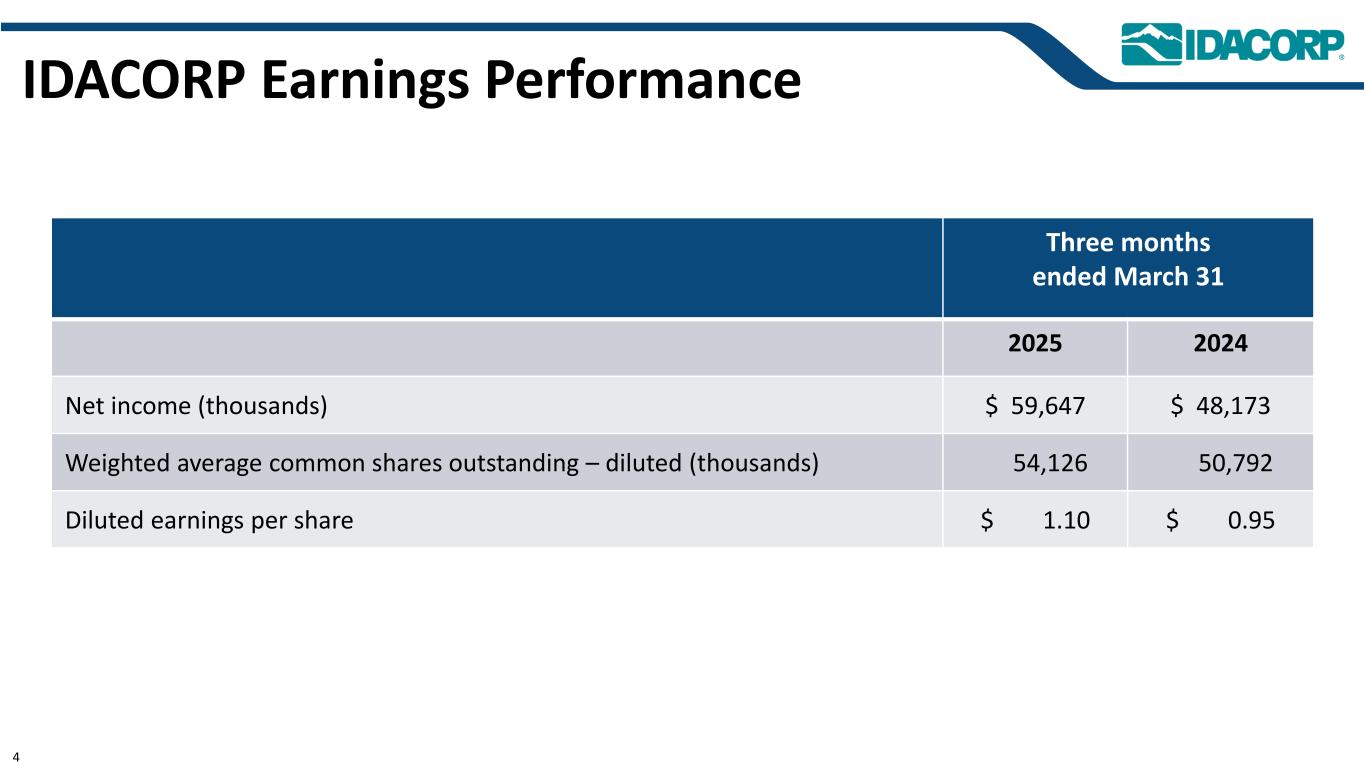 IDACORP Earnings Performance Three months ended March 31 2025 2024 Net income (thousands) $ 59,647 $ 48,173 Weighted average common shares outstanding – diluted (thousands) 54,126 50,792 Diluted earnings per share $ 1.10 $ 0.95 4