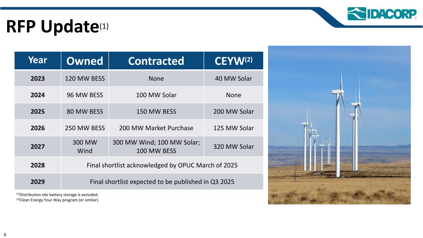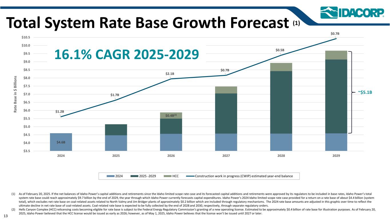 $4.6B $0.4B(2) $1.2B $1.7B $2.1B $0.7B $0.5B $0.7B $3.5 $4.0 $4.5 $5.0 $5.5 $6.0 $6.5 $7.0 $7.5 $8.0 $8.5 $9.0 $9.5 $10.0 $10.5 2024 2025 2026 2027 2028 2029 Ra te B as e in $ B ill io ns 2024 2025 -2029 HCC Construction work in progress (CWIP) estimated year-end balance Total System Rate Base Growth Forecast (1) (1) As of February 20, 2025. If the net balances of Idaho Power’s capital additions and retirements since the Idaho limited scope rate case and its forecasted capital additions and retirements were approved by its regulators to be included in base rates, Idaho Power’s total system rate base could reach approximately $9.7 billion by the end of 2029, the year through which Idaho Power currently forecasts capital expenditures. Idaho Power’s 2024 Idaho limited scope rate case provided for a return on a rate base of about $4.4 billion (system total), which excludes net rate base on coal-related assets related to North Valmy and Jim Bridger plants of approximately $0.2 billion which are included through regulatory mechanisms. The 2024 rate base amounts are adjusted in this graphic over time to reflect the ultimate decline in net rate base of coal-related assets. Coal-related rate base is expected to be fully collected by the end of 2028 and 2030, respectively, through separate regulatory orders. (2) Hells Canyon Complex (HCC) relicensing costs becoming eligible for rate base is subject to the Federal Energy Regulatory Commission’s granting of a new operating license. Estimated to be approximately $0.4 billion of rate base for illustration purposes. As of February 20, 2025, Idaho Power believed that the HCC license would be issued as early as 2026; however, as of May 1, 2025, Idaho Power believes that the license won’t be issued until 2027 or later. 16.1% CAGR 2025-2029 ~$5.1B 13