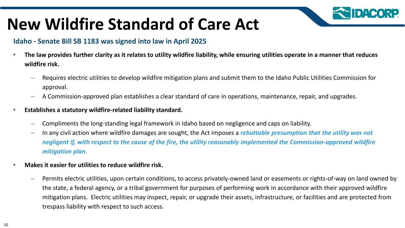 Idaho - Senate Bill SB 1183 was signed into law in April 2025 • The law provides further clarity as it relates to utility wildfire liability, while ensuring utilities operate in a manner that reduces wildfire risk. – Requires electric utilities to develop wildfire mitigation plans and submit them to the Idaho Public Utilities Commission for approval. – A Commission-approved plan establishes a clear standard of care in operations, maintenance, repair, and upgrades. • Establishes a statutory wildfire-related liability standard. – Compliments the long-standing legal framework in Idaho based on negligence and caps on liability. – In any civil action where wildfire damages are sought, the Act imposes a rebuttable presumption that the utility was not negligent if, with respect to the cause of the fire, the utility reasonably implemented the Commission-approved wildfire mitigation plan. • Makes it easier for utilities to reduce wildfire risk. – Permits electric utilities, upon certain conditions, to access privately-owned land or easements or rights-of-way on land owned by the state, a federal agency, or a tribal government for purposes of performing work in accordance with their approved wildfire mitigation plans. Electric utilities may inspect, repair, or upgrade their assets, infrastructure, or facilities and are protected from trespass liability with respect to such access. New Wildfire Standard of Care Act 10