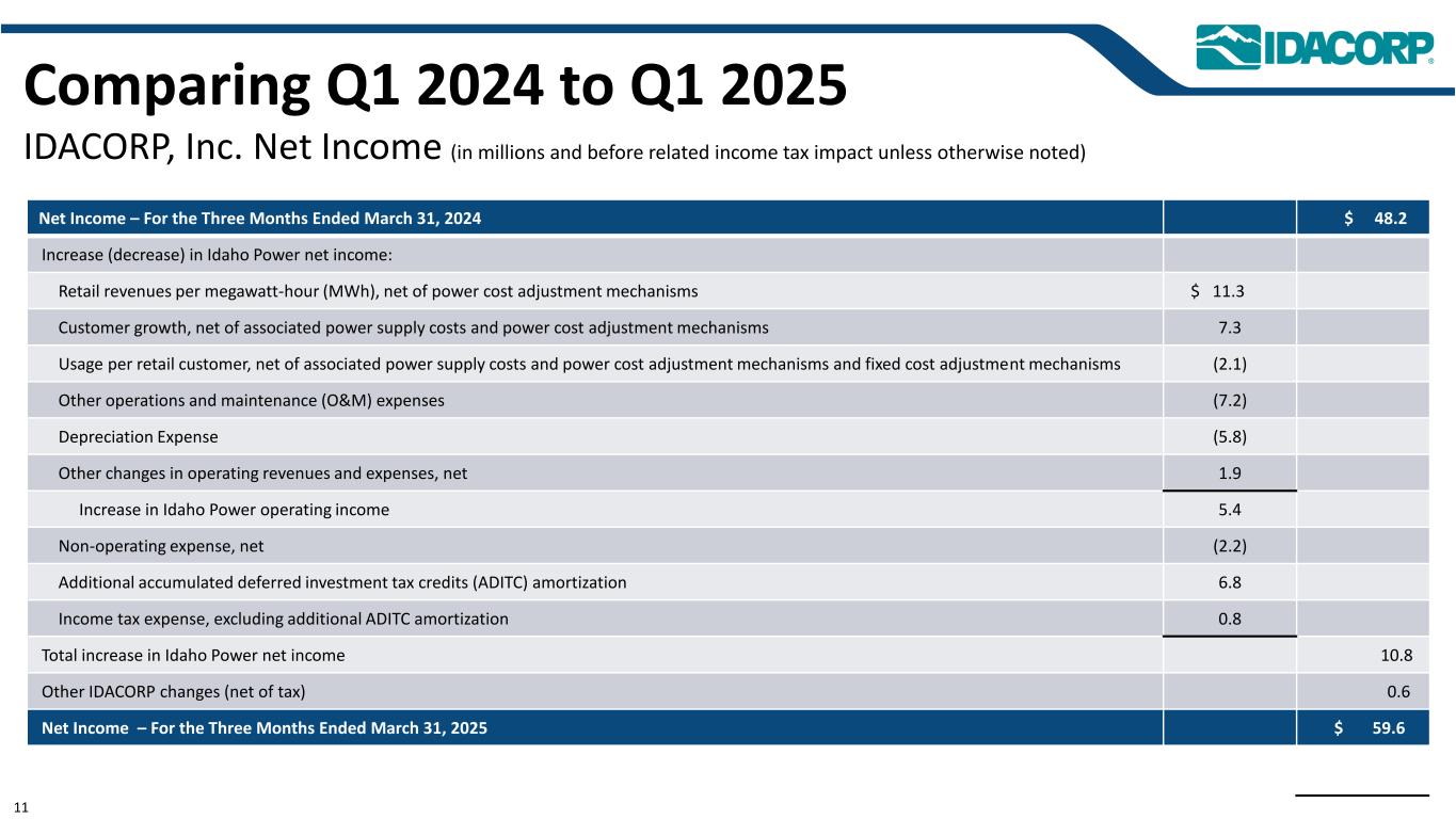 Comparing Q1 2024 to Q1 2025 IDACORP, Inc. Net Income (in millions and before related income tax impact unless otherwise noted) Net Income – For the Three Months Ended March 31, 2024 $ 48.2 Increase (decrease) in Idaho Power net income: Retail revenues per megawatt-hour (MWh), net of power cost adjustment mechanisms $ 11.3 Customer growth, net of associated power supply costs and power cost adjustment mechanisms 7.3 Usage per retail customer, net of associated power supply costs and power cost adjustment mechanisms and fixed cost adjustment mechanisms (2.1) Other operations and maintenance (O&M) expenses (7.2) Depreciation Expense (5.8) Other changes in operating revenues and expenses, net 1.9 Increase in Idaho Power operating income 5.4 Non-operating expense, net (2.2) Additional accumulated deferred investment tax credits (ADITC) amortization 6.8 Income tax expense, excluding additional ADITC amortization 0.8 Total increase in Idaho Power net income 10.8 Other IDACORP changes (net of tax) 0.6 Net Income – For the Three Months Ended March 31, 2025 $ 59.6 11