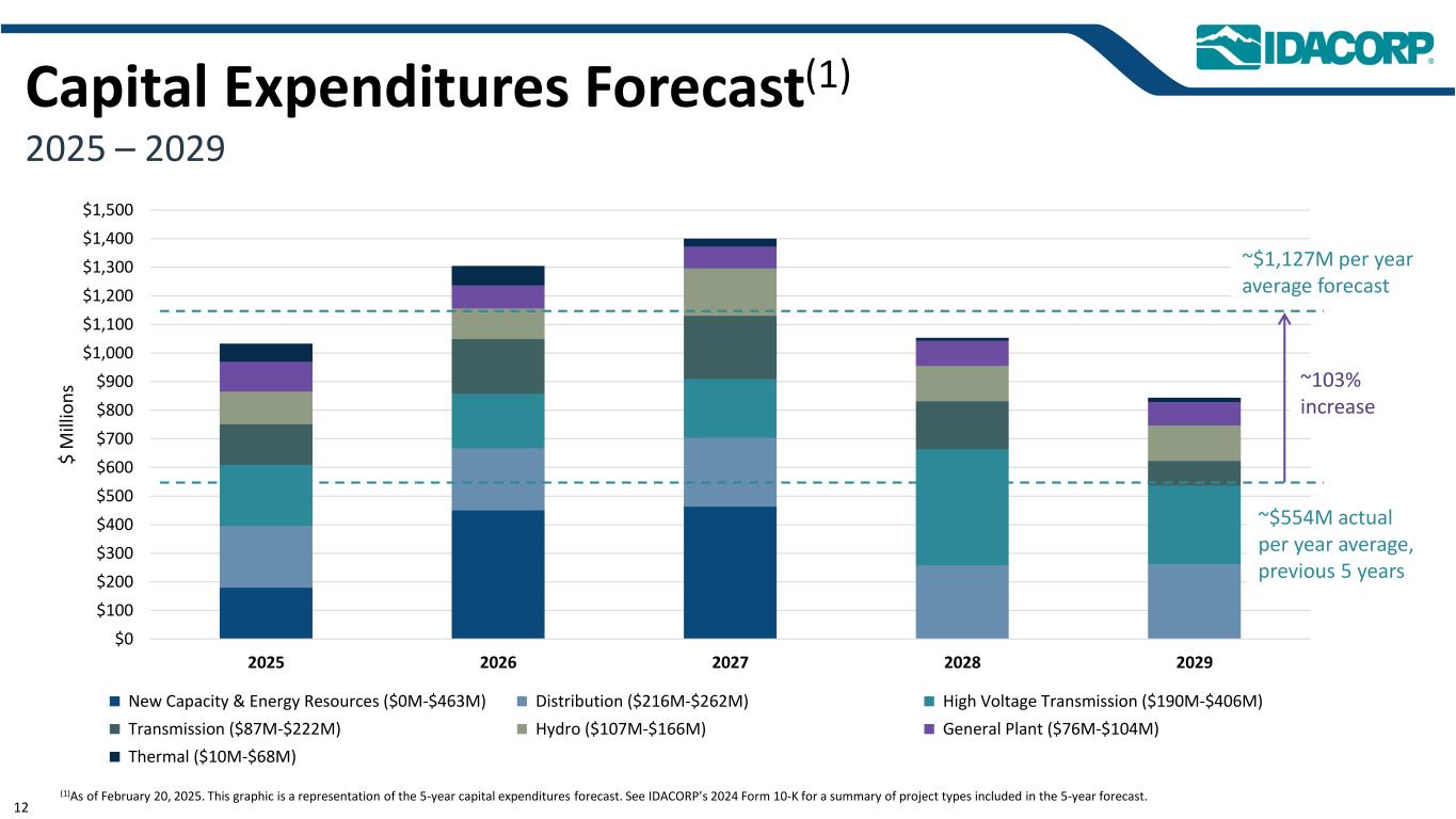 Capital Expenditures Forecast(1) 2025 – 2029 $0 $100 $200 $300 $400 $500 $600 $700 $800 $900 $1,000 $1,100 $1,200 $1,300 $1,400 $1,500 2025 2026 2027 2028 2029 $ M ill io n s New Capacity & Energy Resources ($0M-$463M) Distribution ($216M-$262M) High Voltage Transmission ($190M-$406M) Transmission ($87M-$222M) Hydro ($107M-$166M) General Plant ($76M-$104M) Thermal ($10M-$68M) (1)As of February 20, 2025. This graphic is a representation of the 5-year capital expenditures forecast. See IDACORP’s 2024 Form 10-K for a summary of project types included in the 5-year forecast. ~$554M actual per year average, previous 5 years ~103% increase ~$1,127M per year average forecast 12