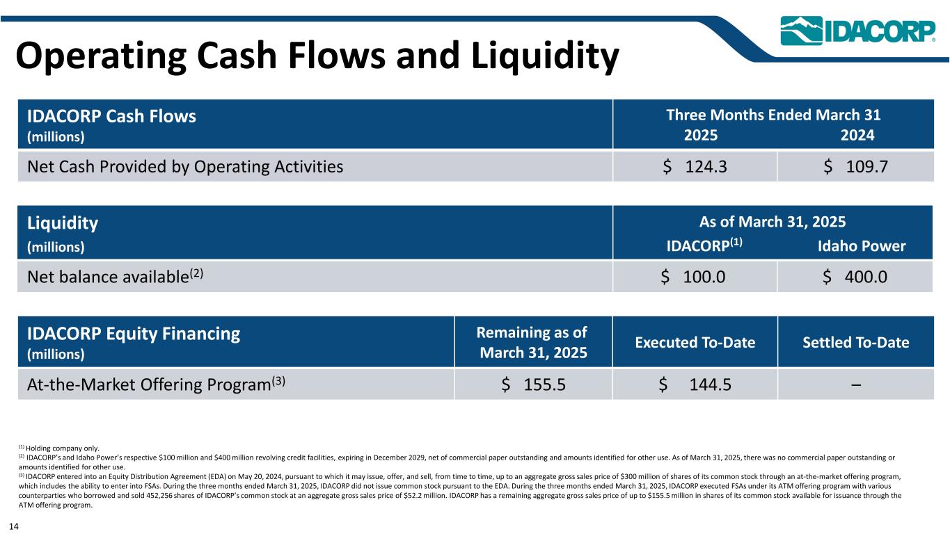 Liquidity (millions) As of March 31, 2025 IDACORP(1) Idaho Power Net balance available(2) $ 100.0 $ 400.0 Operating Cash Flows and Liquidity (1) Holding company only. (2) IDACORP’s and Idaho Power’s respective $100 million and $400 million revolving credit facilities, expiring in December 2029, net of commercial paper outstanding and amounts identified for other use. As of March 31, 2025, there was no commercial paper outstanding or amounts identified for other use. (3) IDACORP entered into an Equity Distribution Agreement (EDA) on May 20, 2024, pursuant to which it may issue, offer, and sell, from time to time, up to an aggregate gross sales price of $300 million of shares of its common stock through an at-the-market offering program, which includes the ability to enter into FSAs. During the three months ended March 31, 2025, IDACORP did not issue common stock pursuant to the EDA. During the three months ended March 31, 2025, IDACORP executed FSAs under its ATM offering program with various counterparties who borrowed and sold 452,256 shares of IDACORP’s common stock at an aggregate gross sales price of $52.2 million. IDACORP has a remaining aggregate gross sales price of up to $155.5 million in shares of its common stock available for issuance through the ATM offering program. IDACORP Cash Flows (millions) Three Months Ended March 31 2025 2024 Net Cash Provided by Operating Activities $ 124.3 $ 109.7 IDACORP Equity Financing (millions) Remaining as of March 31, 2025 Executed To-Date Settled To-Date At-the-Market Offering Program(3) $ 155.5 $ 144.5 – 14