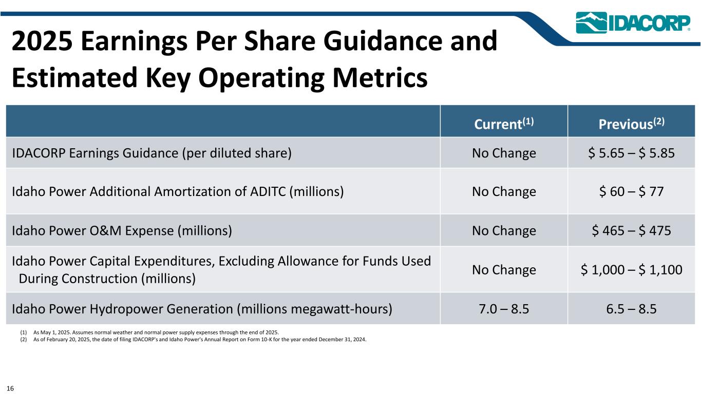 2025 Earnings Per Share Guidance and Estimated Key Operating Metrics Current(1) Previous(2) IDACORP Earnings Guidance (per diluted share) No Change $ 5.65 – $ 5.85 Idaho Power Additional Amortization of ADITC (millions) No Change $ 60 – $ 77 Idaho Power O&M Expense (millions) No Change $ 465 – $ 475 Idaho Power Capital Expenditures, Excluding Allowance for Funds Used During Construction (millions) No Change $ 1,000 – $ 1,100 Idaho Power Hydropower Generation (millions megawatt-hours) 7.0 – 8.5 6.5 – 8.5 (1) As May 1, 2025. Assumes normal weather and normal power supply expenses through the end of 2025. (2) As of February 20, 2025, the date of filing IDACORP's and Idaho Power's Annual Report on Form 10-K for the year ended December 31, 2024. 16