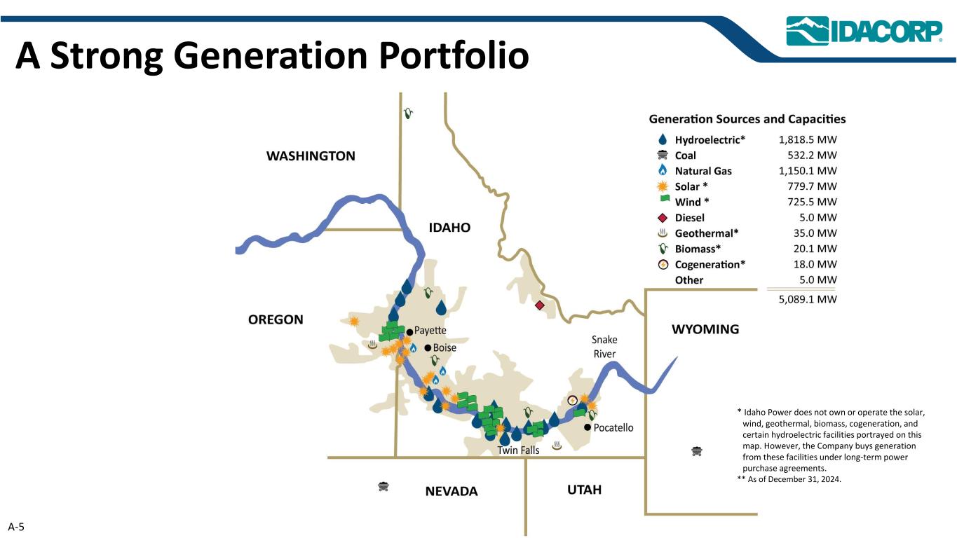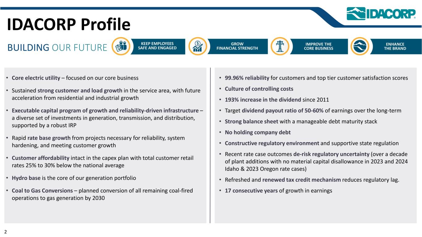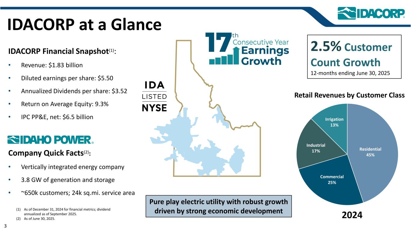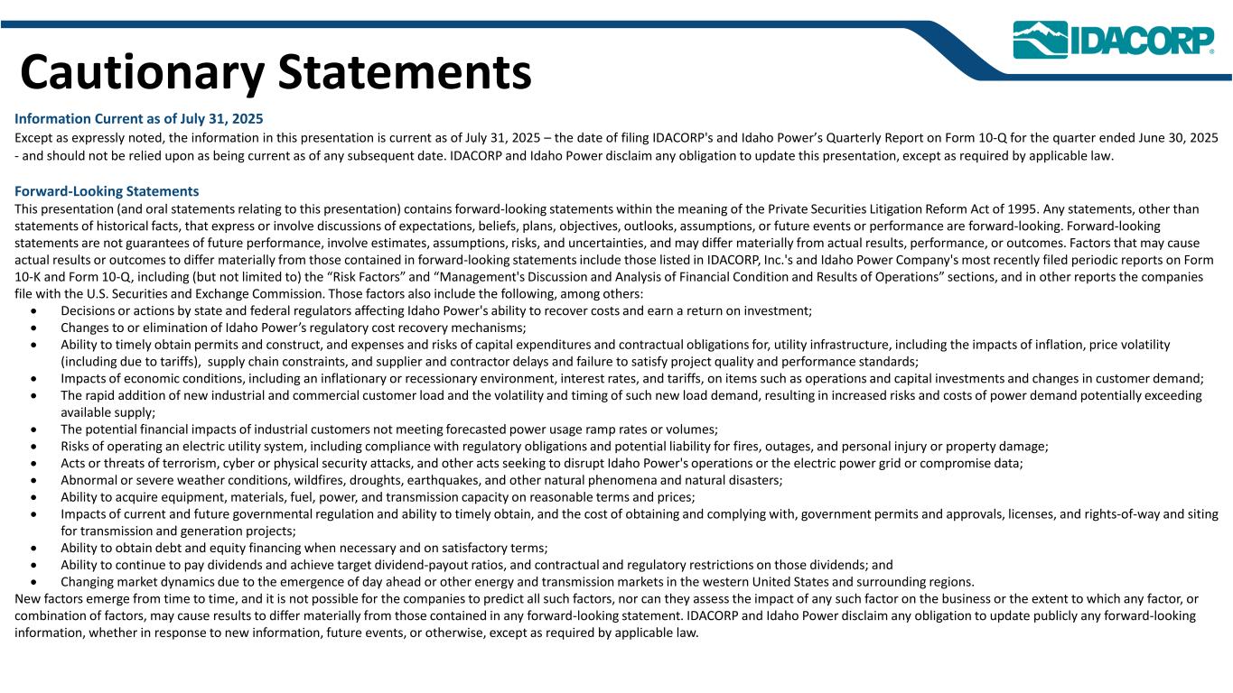 Cautionary Statements Information Current as of July 31, 2025 Except as expressly noted, the information in this presentation is current as of July 31, 2025 – the date of filing IDACORP's and Idaho Power’s Quarterly Report on Form 10-Q for the quarter ended June 30, 2025 - and should not be relied upon as being current as of any subsequent date. IDACORP and Idaho Power disclaim any obligation to update this presentation, except as required by applicable law. Forward-Looking Statements This presentation (and oral statements relating to this presentation) contains forward-looking statements within the meaning of the Private Securities Litigation Reform Act of 1995. Any statements, other than statements of historical facts, that express or involve discussions of expectations, beliefs, plans, objectives, outlooks, assumptions, or future events or performance are forward-looking. Forward-looking statements are not guarantees of future performance, involve estimates, assumptions, risks, and uncertainties, and may differ materially from actual results, performance, or outcomes. Factors that may cause actual results or outcomes to differ materially from those contained in forward-looking statements include those listed in IDACORP, Inc.'s and Idaho Power Company's most recently filed periodic reports on Form 10-K and Form 10-Q, including (but not limited to) the “Risk Factors” and “Management's Discussion and Analysis of Financial Condition and Results of Operations” sections, and in other reports the companies file with the U.S. Securities and Exchange Commission. Those factors also include the following, among others: • Decisions or actions by state and federal regulators affecting Idaho Power's ability to recover costs and earn a return on investment; • Changes to or elimination of Idaho Power’s regulatory cost recovery mechanisms; • Ability to timely obtain permits and construct, and expenses and risks of capital expenditures and contractual obligations for, utility infrastructure, including the impacts of inflation, price volatility (including due to tariffs), supply chain constraints, and supplier and contractor delays and failure to satisfy project quality and performance standards; • Impacts of economic conditions, including an inflationary or recessionary environment, interest rates, and tariffs, on items such as operations and capital investments and changes in customer demand; • The rapid addition of new industrial and commercial customer load and the volatility and timing of such new load demand, resulting in increased risks and costs of power demand potentially exceeding available supply; • The potential financial impacts of industrial customers not meeting forecasted power usage ramp rates or volumes; • Risks of operating an electric utility system, including compliance with regulatory obligations and potential liability for fires, outages, and personal injury or property damage; • Acts or threats of terrorism, cyber or physical security attacks, and other acts seeking to disrupt Idaho Power's operations or the electric power grid or compromise data; • Abnormal or severe weather conditions, wildfires, droughts, earthquakes, and other natural phenomena and natural disasters; • Ability to acquire equipment, materials, fuel, power, and transmission capacity on reasonable terms and prices; • Impacts of current and future governmental regulation and ability to timely obtain, and the cost of obtaining and complying with, government permits and approvals, licenses, and rights-of-way and siting for transmission and generation projects; • Ability to obtain debt and equity financing when necessary and on satisfactory terms; • Ability to continue to pay dividends and achieve target dividend-payout ratios, and contractual and regulatory restrictions on those dividends; and • Changing market dynamics due to the emergence of day ahead or other energy and transmission markets in the western United States and surrounding regions. New factors emerge from time to time, and it is not possible for the companies to predict all such factors, nor can they assess the impact of any such factor on the business or the extent to which any factor, or combination of factors, may cause results to differ materially from those contained in any forward-looking statement. IDACORP and Idaho Power disclaim any obligation to update publicly any forward-looking information, whether in response to new information, future events, or otherwise, except as required by applicable law.