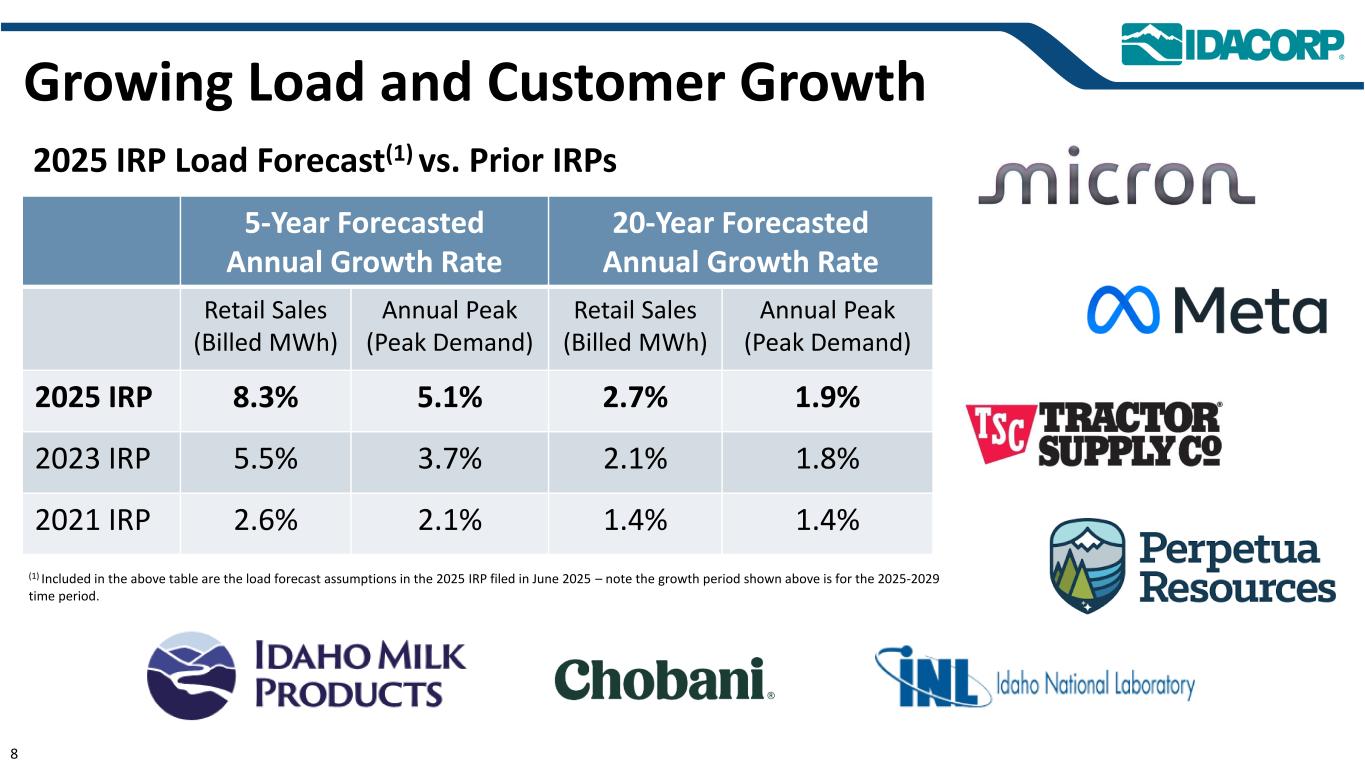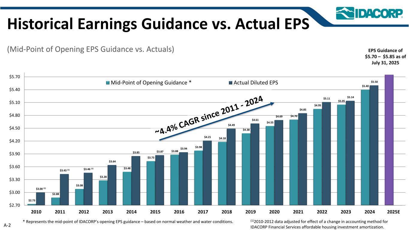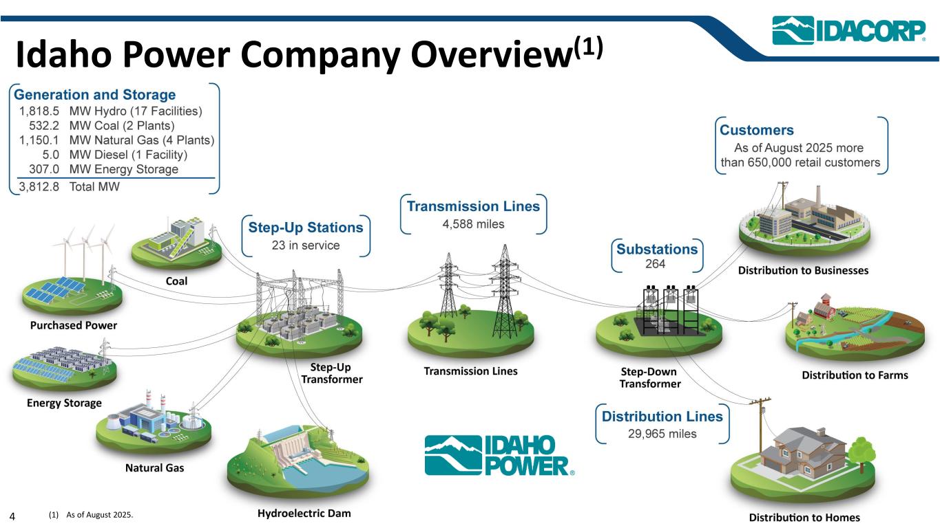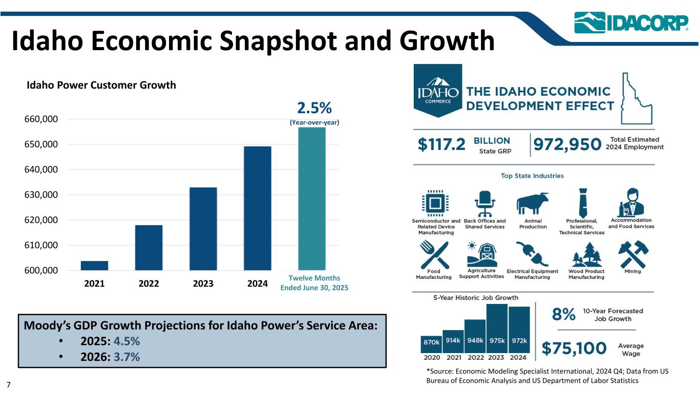 Cautionary Statements Information Current as of July 31, 2025 Except as expressly noted, the information in this presentation is current as of July 31, 2025 – the date of filing IDACORP's and Idaho Power’s Quarterly Report on Form 10-Q for the quarter ended June 30, 2025 - and should not be relied upon as being current as of any subsequent date. IDACORP and Idaho Power disclaim any obligation to update this presentation, except as required by applicable law. Forward-Looking Statements This presentation (and oral statements relating to this presentation) contains forward-looking statements within the meaning of the Private Securities Litigation Reform Act of 1995. Any statements, other than statements of historical facts, that express or involve discussions of expectations, beliefs, plans, objectives, outlooks, assumptions, or future events or performance are forward-looking. Forward-looking statements are not guarantees of future performance, involve estimates, assumptions, risks, and uncertainties, and may differ materially from actual results, performance, or outcomes. Factors that may cause actual results or outcomes to differ materially from those contained in forward-looking statements include those listed in IDACORP, Inc.'s and Idaho Power Company's most recently filed periodic reports on Form 10-K and Form 10-Q, including (but not limited to) the “Risk Factors” and “Management's Discussion and Analysis of Financial Condition and Results of Operations” sections, and in other reports the companies file with the U.S. Securities and Exchange Commission. Those factors also include the following, among others: • Decisions or actions by state and federal regulators affecting Idaho Power's ability to recover costs and earn a return on investment; • Changes to or elimination of Idaho Power’s regulatory cost recovery mechanisms; • Ability to timely obtain permits and construct, and expenses and risks of capital expenditures and contractual obligations for, utility infrastructure, including the impacts of inflation, price volatility (including due to tariffs), supply chain constraints, and supplier and contractor delays and failure to satisfy project quality and performance standards; • Impacts of economic conditions, including an inflationary or recessionary environment, interest rates, and tariffs, on items such as operations and capital investments and changes in customer demand; • The rapid addition of new industrial and commercial customer load and the volatility and timing of such new load demand, resulting in increased risks and costs of power demand potentially exceeding available supply; • The potential financial impacts of industrial customers not meeting forecasted power usage ramp rates or volumes; • Risks of operating an electric utility system, including compliance with regulatory obligations and potential liability for fires, outages, and personal injury or property damage; • Acts or threats of terrorism, cyber or physical security attacks, and other acts seeking to disrupt Idaho Power's operations or the electric power grid or compromise data; • Abnormal or severe weather conditions, wildfires, droughts, earthquakes, and other natural phenomena and natural disasters; • Ability to acquire equipment, materials, fuel, power, and transmission capacity on reasonable terms and prices; • Impacts of current and future governmental regulation and ability to timely obtain, and the cost of obtaining and complying with, government permits and approvals, licenses, and rights-of-way and siting for transmission and generation projects; • Ability to obtain debt and equity financing when necessary and on satisfactory terms; • Ability to continue to pay dividends and achieve target dividend-payout ratios, and contractual and regulatory restrictions on those dividends; and • Changing market dynamics due to the emergence of day ahead or other energy and transmission markets in the western United States and surrounding regions. New factors emerge from time to time, and it is not possible for the companies to predict all such factors, nor can they assess the impact of any such factor on the business or the extent to which any factor, or combination of factors, may cause results to differ materially from those contained in any forward-looking statement. IDACORP and Idaho Power disclaim any obligation to update publicly any forward-looking information, whether in response to new information, future events, or otherwise, except as required by applicable law.