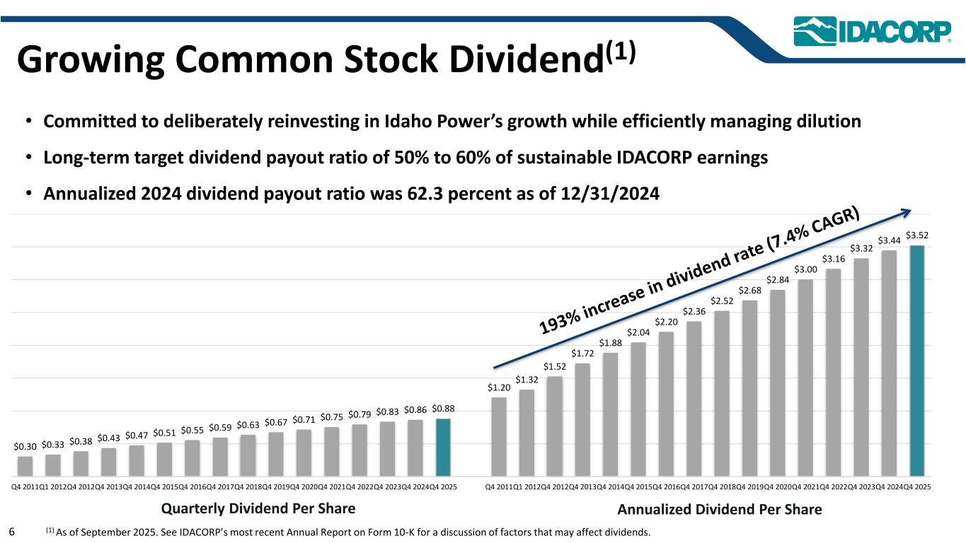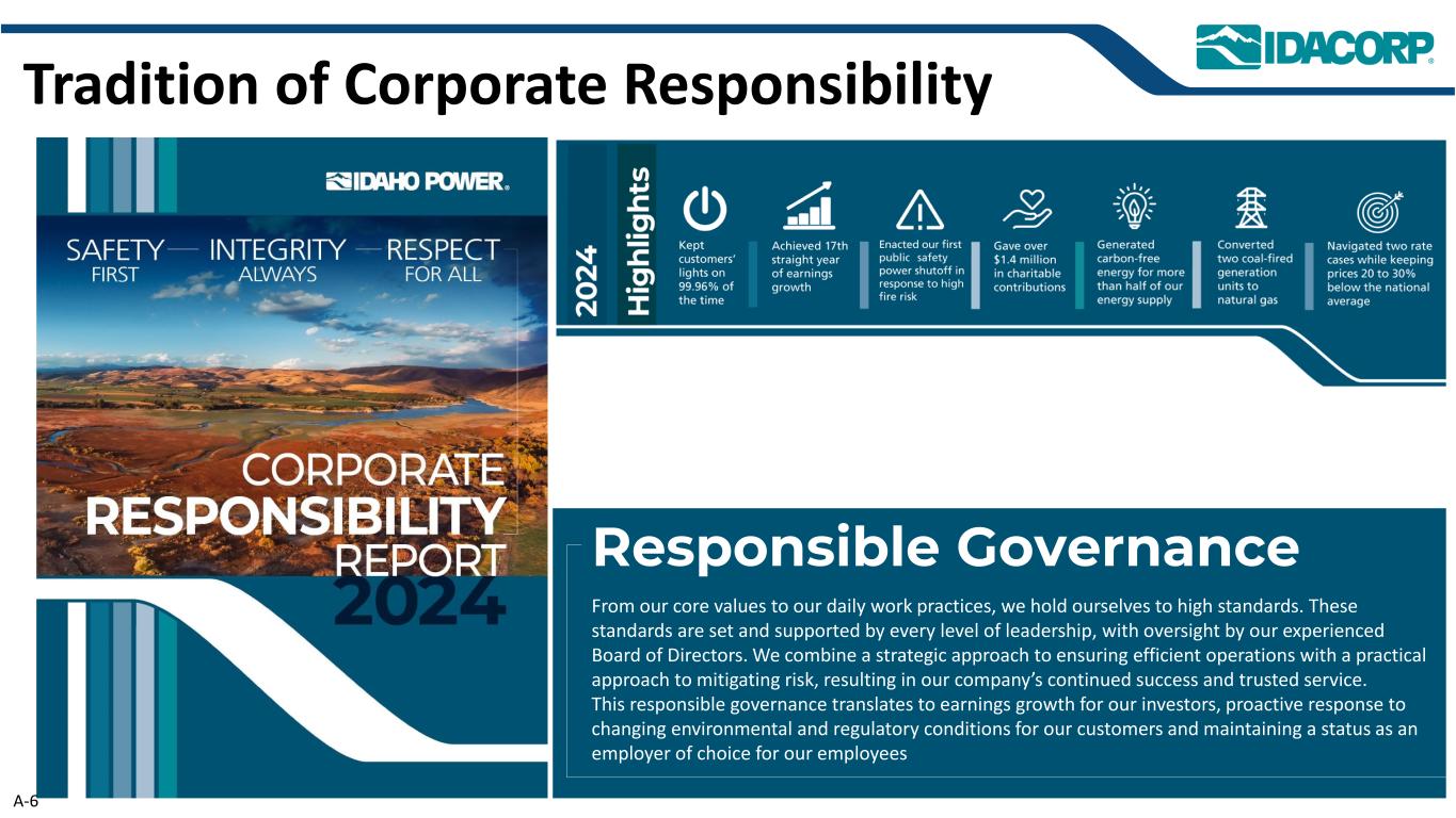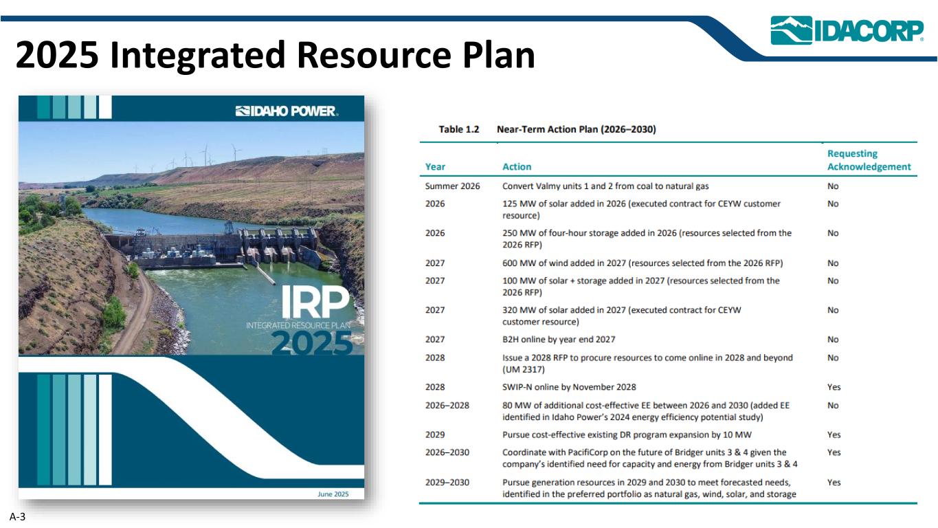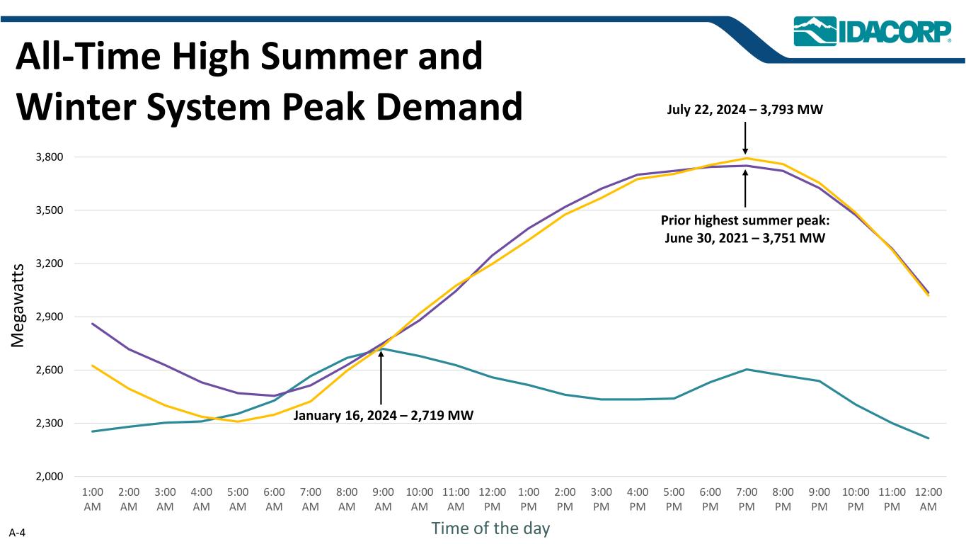 Cautionary Statements Information Current as of July 31, 2025 Except as expressly noted, the information in this presentation is current as of July 31, 2025 – the date of filing IDACORP's and Idaho Power’s Quarterly Report on Form 10-Q for the quarter ended June 30, 2025 - and should not be relied upon as being current as of any subsequent date. IDACORP and Idaho Power disclaim any obligation to update this presentation, except as required by applicable law. Forward-Looking Statements This presentation (and oral statements relating to this presentation) contains forward-looking statements within the meaning of the Private Securities Litigation Reform Act of 1995. Any statements, other than statements of historical facts, that express or involve discussions of expectations, beliefs, plans, objectives, outlooks, assumptions, or future events or performance are forward-looking. Forward-looking statements are not guarantees of future performance, involve estimates, assumptions, risks, and uncertainties, and may differ materially from actual results, performance, or outcomes. Factors that may cause actual results or outcomes to differ materially from those contained in forward-looking statements include those listed in IDACORP, Inc.'s and Idaho Power Company's most recently filed periodic reports on Form 10-K and Form 10-Q, including (but not limited to) the “Risk Factors” and “Management's Discussion and Analysis of Financial Condition and Results of Operations” sections, and in other reports the companies file with the U.S. Securities and Exchange Commission. Those factors also include the following, among others: • Decisions or actions by state and federal regulators affecting Idaho Power's ability to recover costs and earn a return on investment; • Changes to or elimination of Idaho Power’s regulatory cost recovery mechanisms; • Ability to timely obtain permits and construct, and expenses and risks of capital expenditures and contractual obligations for, utility infrastructure, including the impacts of inflation, price volatility (including due to tariffs), supply chain constraints, and supplier and contractor delays and failure to satisfy project quality and performance standards; • Impacts of economic conditions, including an inflationary or recessionary environment, interest rates, and tariffs, on items such as operations and capital investments and changes in customer demand; • The rapid addition of new industrial and commercial customer load and the volatility and timing of such new load demand, resulting in increased risks and costs of power demand potentially exceeding available supply; • The potential financial impacts of industrial customers not meeting forecasted power usage ramp rates or volumes; • Risks of operating an electric utility system, including compliance with regulatory obligations and potential liability for fires, outages, and personal injury or property damage; • Acts or threats of terrorism, cyber or physical security attacks, and other acts seeking to disrupt Idaho Power's operations or the electric power grid or compromise data; • Abnormal or severe weather conditions, wildfires, droughts, earthquakes, and other natural phenomena and natural disasters; • Ability to acquire equipment, materials, fuel, power, and transmission capacity on reasonable terms and prices; • Impacts of current and future governmental regulation and ability to timely obtain, and the cost of obtaining and complying with, government permits and approvals, licenses, and rights-of-way and siting for transmission and generation projects; • Ability to obtain debt and equity financing when necessary and on satisfactory terms; • Ability to continue to pay dividends and achieve target dividend-payout ratios, and contractual and regulatory restrictions on those dividends; and • Changing market dynamics due to the emergence of day ahead or other energy and transmission markets in the western United States and surrounding regions. New factors emerge from time to time, and it is not possible for the companies to predict all such factors, nor can they assess the impact of any such factor on the business or the extent to which any factor, or combination of factors, may cause results to differ materially from those contained in any forward-looking statement. IDACORP and Idaho Power disclaim any obligation to update publicly any forward-looking information, whether in response to new information, future events, or otherwise, except as required by applicable law.