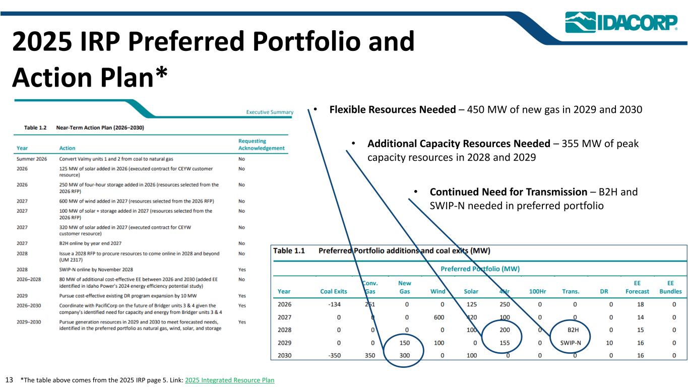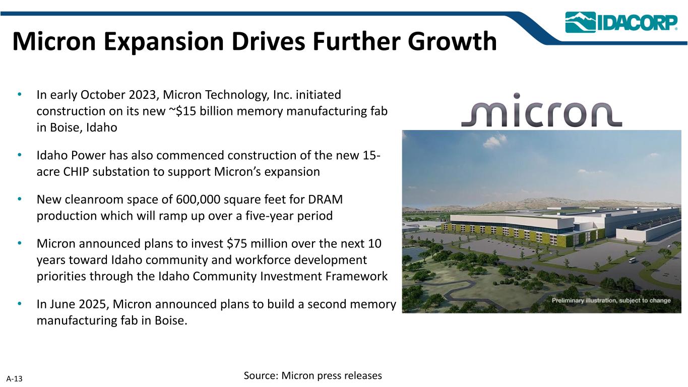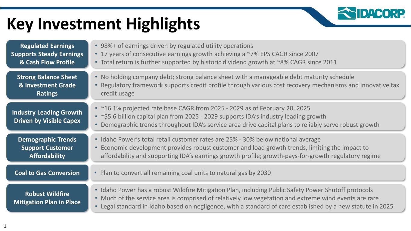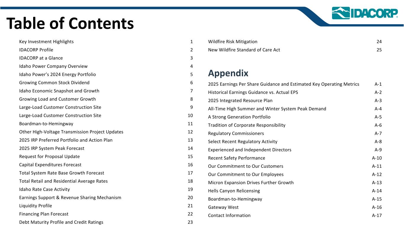 Table of Contents Key Investment Highlights 1 IDACORP Profile 2 IDACORP at a Glance 3 Idaho Power Company Overview 4 Idaho Power’s 2024 Energy Portfolio 5 Growing Common Stock Dividend 6 Idaho Economic Snapshot and Growth 7 Growing Load and Customer Growth 8 Large-Load Customer Construction Site 9 Large-Load Customer Construction Site 10 Boardman-to-Hemingway 11 Other High-Voltage Transmission Project Updates 12 2025 IRP Preferred Portfolio and Action Plan 13 2025 IRP System Peak Forecast 14 Request for Proposal Update 15 Capital Expenditures Forecast 16 Total System Rate Base Growth Forecast 17 Total Retail and Residential Average Rates 18 Idaho Rate Case Activity 19 Earnings Support & Revenue Sharing Mechanism 20 Liquidity Profile 21 Financing Plan Forecast 22 Debt Maturity Profile and Credit Ratings 23 Wildfire Risk Mitigation 24 New Wildfire Standard of Care Act 25 Appendix 2025 Earnings Per Share Guidance and Estimated Key Operating Metrics A-1 Historical Earnings Guidance vs. Actual EPS A-2 2025 Integrated Resource Plan A-3 All-Time High Summer and Winter System Peak Demand A-4 A Strong Generation Portfolio A-5 Tradition of Corporate Responsibility A-6 Regulatory Commissioners A-7 Select Recent Regulatory Activity A-8 Experienced and Independent Directors A-9 Recent Safety Performance A-10 Our Commitment to Our Customers A-11 Our Commitment to Our Employees A-12 Micron Expansion Drives Further Growth A-13 Hells Canyon Relicensing A-14 Boardman-to-Hemingway A-15 Gateway West A-16 Contact Information A-17