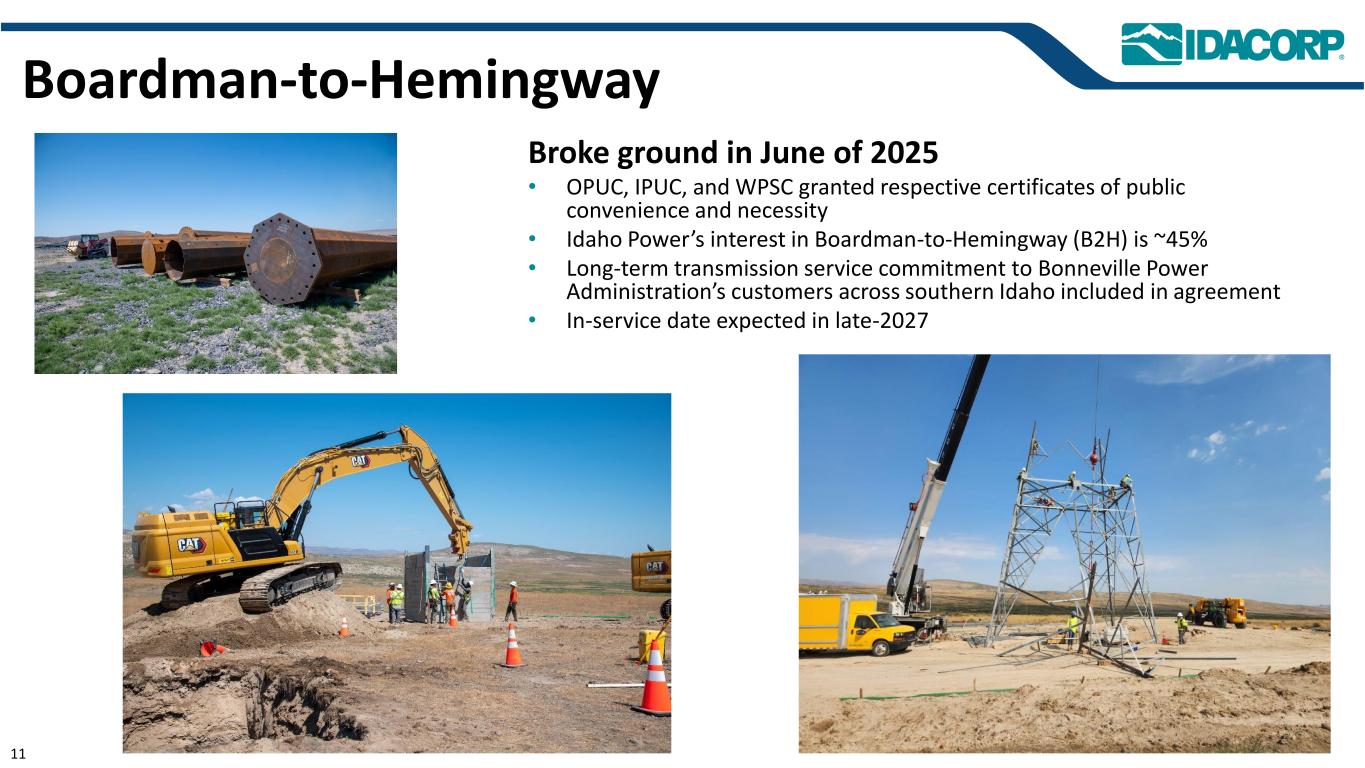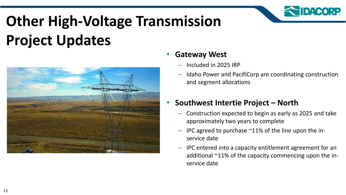 Boardman-to-Hemingway Broke ground in June of 2025 • OPUC, IPUC, and WPSC granted respective certificates of public convenience and necessity • Idaho Power’s interest in Boardman-to-Hemingway (B2H) is ~45% • Long-term transmission service commitment to Bonneville Power Administration’s customers across southern Idaho included in agreement • In-service date expected in late-2027 11