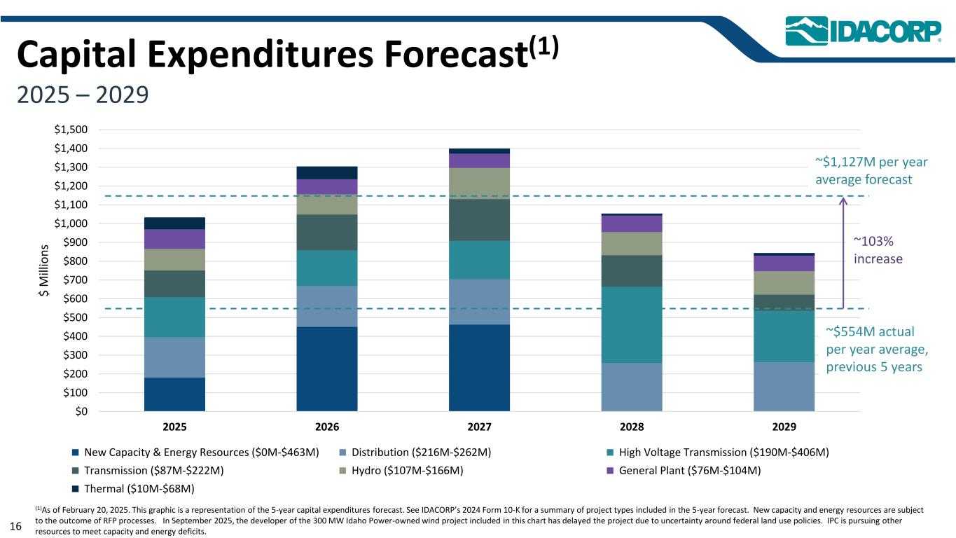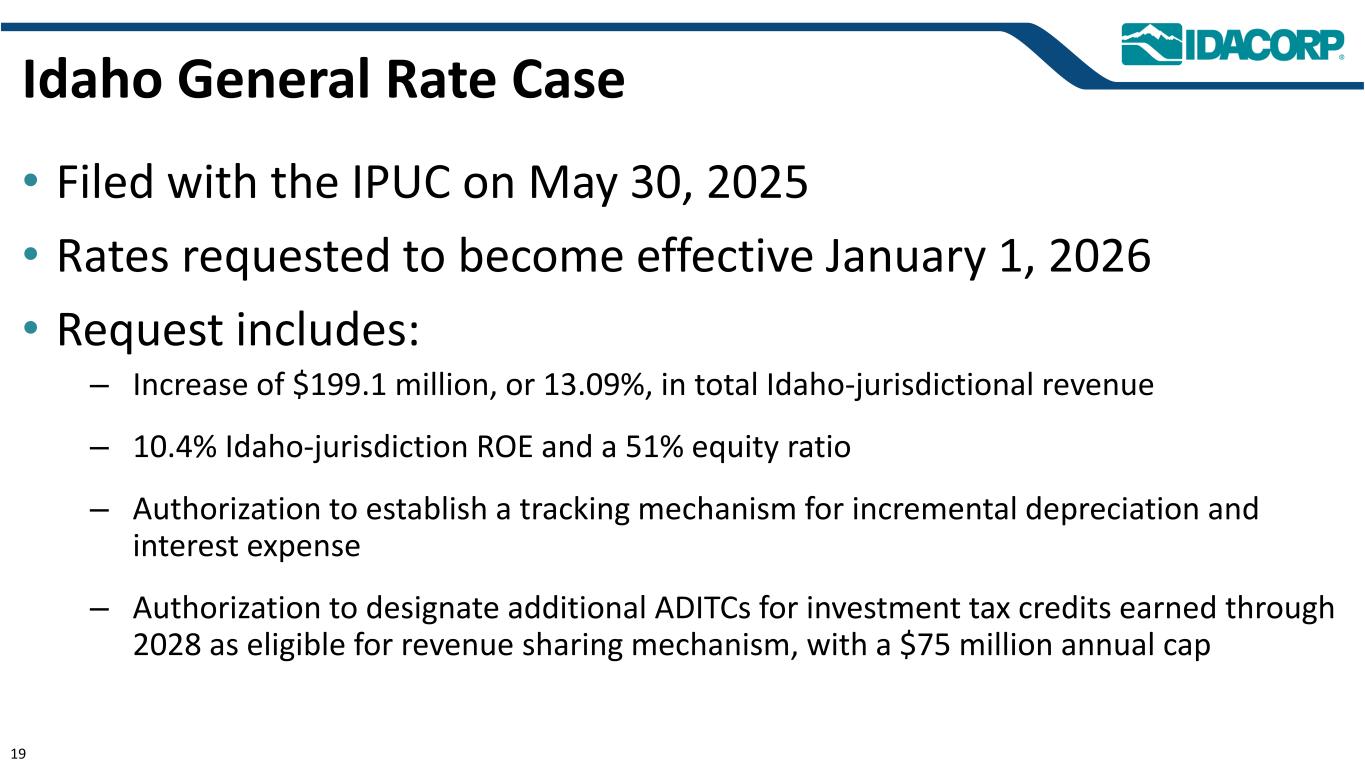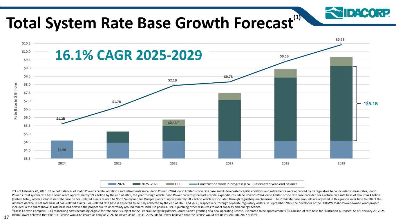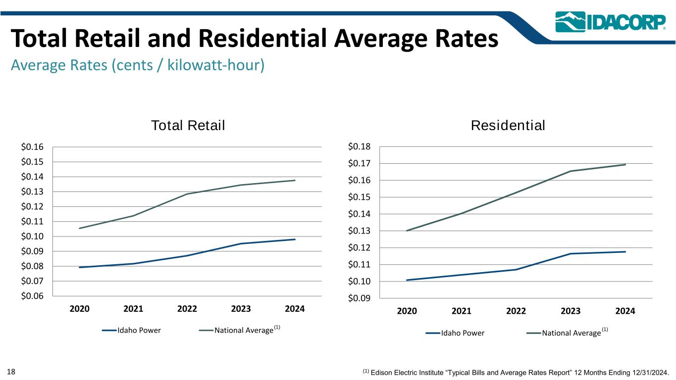 $4.6B $0.4B(2) $1.2B $1.7B $2.1B $0.7B $0.5B $0.7B $3.5 $4.0 $4.5 $5.0 $5.5 $6.0 $6.5 $7.0 $7.5 $8.0 $8.5 $9.0 $9.5 $10.0 $10.5 2024 2025 2026 2027 2028 2029 R at e B as e in $ B ill io n s 2024 2025 -2029 HCC Construction work in progress (CWIP) estimated year-end balance Total System Rate Base Growth Forecast (1) (1)As of February 20, 2025. If the net balances of Idaho Power’s capital additions and retirements since Idaho Power's 2024 Idaho limited scope rate case and its forecasted capital additions and retirements were approved by its regulators to be included in base rates, Idaho Power’s total system rate base could reach approximately $9.7 billion by the end of 2029, the year through which Idaho Power currently forecasts capital expenditures. Idaho Power’s 2024 Idaho limited scope rate case provided for a return on a rate base of about $4.4 billion (system total), which excludes net rate base on coal-related assets related to North Valmy and Jim Bridger plants of approximately $0.2 billion which are included through regulatory mechanisms. The 2024 rate base amounts are adjusted in this graphic over time to reflect the ultimate decline in net rate base of coal-related assets. Coal-related rate base is expected to be fully collected by the end of 2028 and 2030, respectively, through separate regulatory orders. In September 2025, the developer of the 300 MW Idaho Power-owned wind project included in the chart above as rate base has delayed the project due to uncertainty around federal land use policies. IPC is pursuing other resources to meet capacity and energy deficits. (2)Hells Canyon Complex (HCC) relicensing costs becoming eligible for rate base is subject to the Federal Energy Regulatory Commission’s granting of a new operating license. Estimated to be approximately $0.4 billion of rate base for illustration purposes. As of February 20, 2025, Idaho Power believed that the HCC license would be issued as early as 2026; however, as of July 31, 2025, Idaho Power believed that the license would not be issued until 2027 or later. 16.1% CAGR 2025-2029 ~$5.1B 17