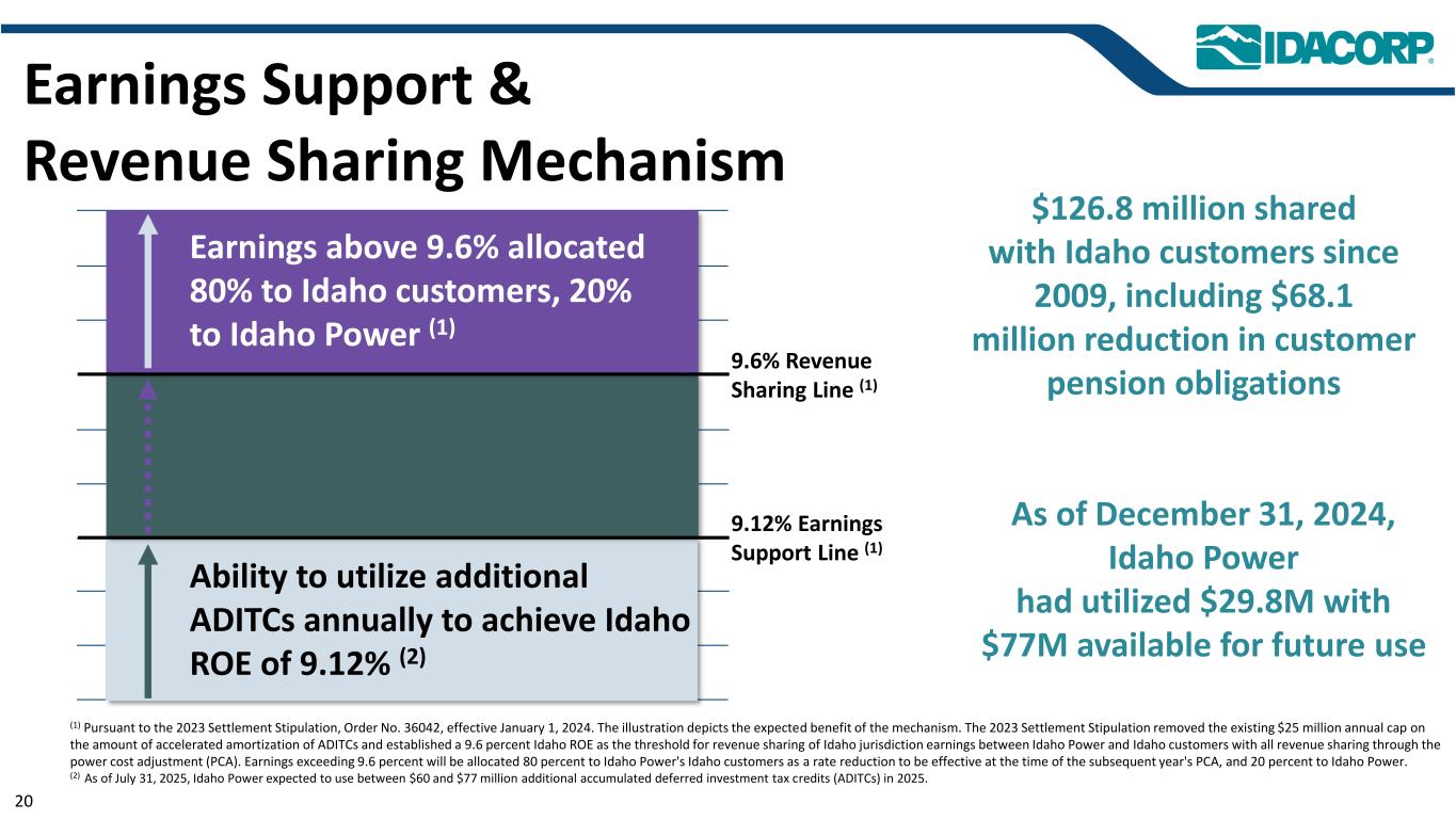 Earnings Support & Revenue Sharing Mechanism (1) Pursuant to the 2023 Settlement Stipulation, Order No. 36042, effective January 1, 2024. The illustration depicts the expected benefit of the mechanism. The 2023 Settlement Stipulation removed the existing $25 million annual cap on the amount of accelerated amortization of ADITCs and established a 9.6 percent Idaho ROE as the threshold for revenue sharing of Idaho jurisdiction earnings between Idaho Power and Idaho customers with all revenue sharing through the power cost adjustment (PCA). Earnings exceeding 9.6 percent will be allocated 80 percent to Idaho Power's Idaho customers as a rate reduction to be effective at the time of the subsequent year's PCA, and 20 percent to Idaho Power. (2) As of July 31, 2025, Idaho Power expected to use between $60 and $77 million additional accumulated deferred investment tax credits (ADITCs) in 2025. Ability to utilize additional ADITCs annually to achieve Idaho ROE of 9.12% (2) 9.12% Earnings Support Line (1) 9.6% Revenue Sharing Line (1) Earnings above 9.6% allocated 80% to Idaho customers, 20% to Idaho Power (1) As of December 31, 2024, Idaho Power had utilized $29.8M with $77M available for future use $126.8 million shared with Idaho customers since 2009, including $68.1 million reduction in customer pension obligations 20