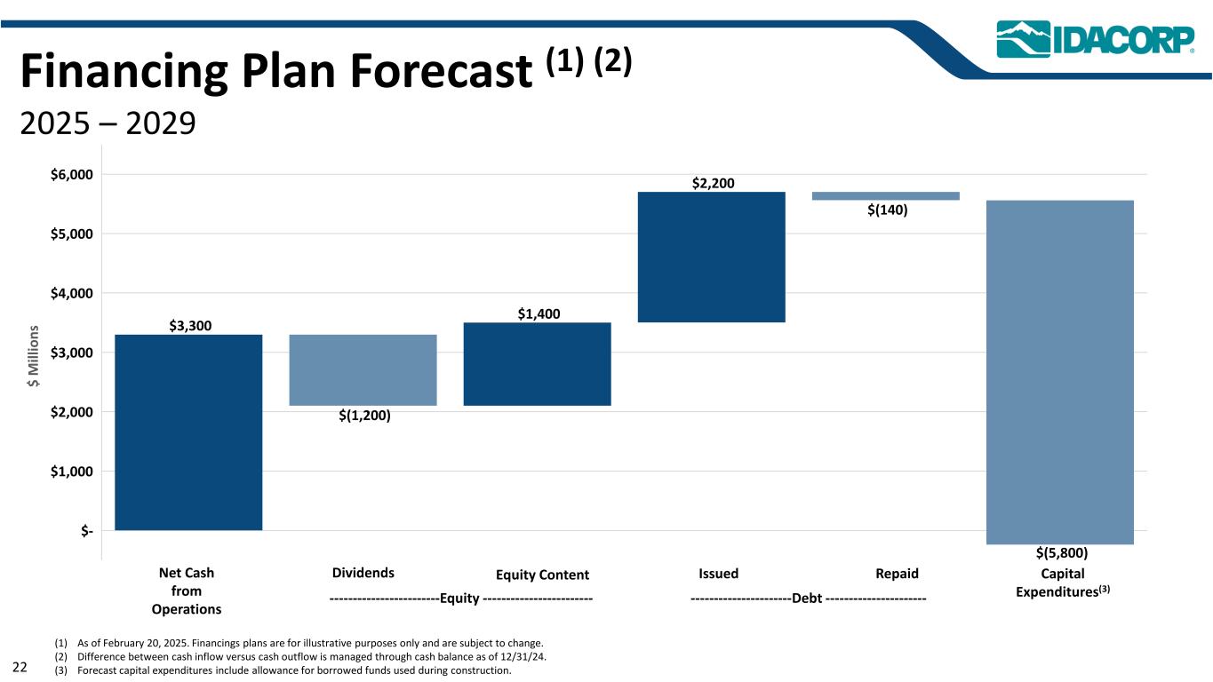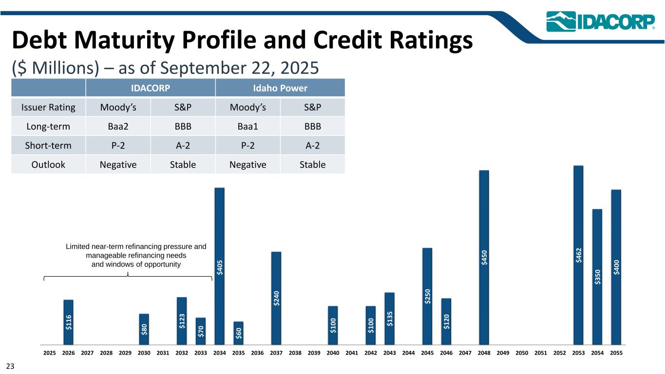 Liquidity (millions) As of June 30, 2025 IDACORP(1) Idaho Power Net balance available(2) $ 100.0 $ 400.0 Liquidity Profile (1) Holding company only. (2) IDACORP’s and Idaho Power’s respective $100 million and $400 million revolving credit facilities, expiring in December 2029, net of commercial paper outstanding and amounts identified for other use. As of June 30, 2025, there was no commercial paper outstanding or amounts identified for other use. (3) IDACORP entered into an Equity Distribution Agreement (EDA) on May 20, 2024, pursuant to which it may issue, offer, and sell, from time to time, up to an aggregate gross sales price of $300 million of shares of its common stock through an at-the-market (ATM) offering program, which includes the ability to enter into Forward Sale Agreements (FSAs). During the three months ended June 30, 2025, IDACORP did not issue common stock pursuant to the EDA, including settling previously executed FSAs, nor did it execute any additional FSAs. (4) IDACORP entered into FSAs, independent of the ATM offering program, with forward counterparties on May 8 & 9, 2025. As of June 30, 2025, pursuant to the terms of the FSAs, IDACORP could have settled by physical delivery of 5,180,180 shares to the forward counterparties in exchange for net proceeds of $560.4 million. The FSAs provide for settlement on a date or dates to be specified at IDACORP’s discretion, but which is expected to occur on or prior to November 9, 2026. IDACORP Equity Financing (millions) Remaining as of June 30, 2025 Net Proceeds Available as of June 30, 2025 Settled To-Date At-the-Market Offering Program(3) $ 155.5 $ 143.5 – Forward Sale Agreements(4) – $ 560.4 – Simple long-term debt and common stock capital structure with no holding company debt 21
