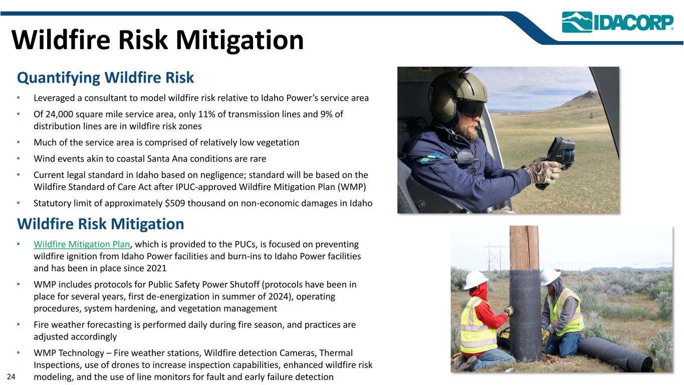 Wildfire Risk Mitigation Quantifying Wildfire Risk • Leveraged a consultant to model wildfire risk relative to Idaho Power’s service area • Of 24,000 square mile service area, only 11% of transmission lines and 9% of distribution lines are in wildfire risk zones • Much of the service area is comprised of relatively low vegetation • Wind events akin to coastal Santa Ana conditions are rare • Current legal standard in Idaho based on negligence; standard will be based on the Wildfire Standard of Care Act after IPUC-approved Wildfire Mitigation Plan (WMP) • Statutory limit of approximately $509 thousand on non-economic damages in Idaho Wildfire Risk Mitigation • Wildfire Mitigation Plan, which is provided to the PUCs, is focused on preventing wildfire ignition from Idaho Power facilities and burn-ins to Idaho Power facilities and has been in place since 2021 • WMP includes protocols for Public Safety Power Shutoff (protocols have been in place for several years, first de-energization in summer of 2024), operating procedures, system hardening, and vegetation management • Fire weather forecasting is performed daily during fire season, and practices are adjusted accordingly • WMP Technology – Fire weather stations, Wildfire detection Cameras, Thermal Inspections, use of drones to increase inspection capabilities, enhanced wildfire risk modeling, and the use of line monitors for fault and early failure detection24