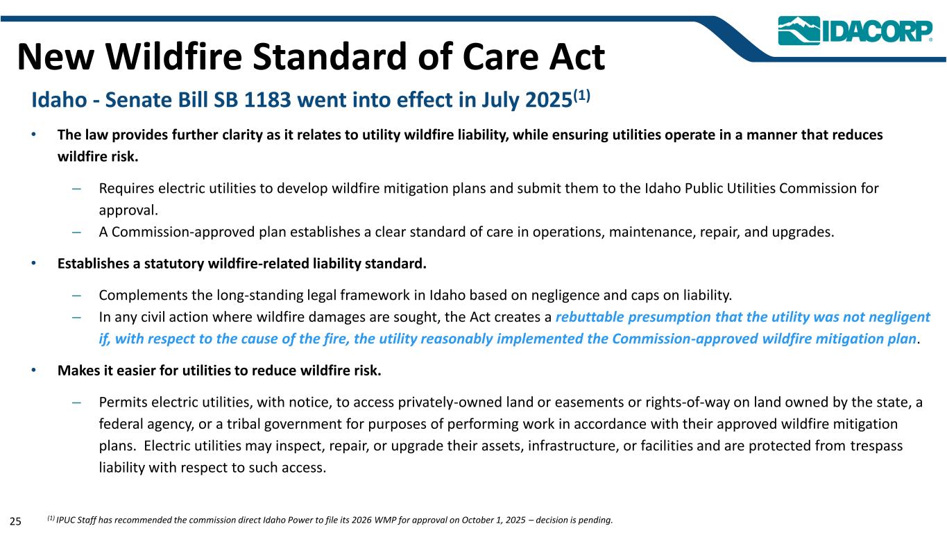 Idaho - Senate Bill SB 1183 went into effect in July 2025(1) • The law provides further clarity as it relates to utility wildfire liability, while ensuring utilities operate in a manner that reduces wildfire risk. – Requires electric utilities to develop wildfire mitigation plans and submit them to the Idaho Public Utilities Commission for approval. – A Commission-approved plan establishes a clear standard of care in operations, maintenance, repair, and upgrades. • Establishes a statutory wildfire-related liability standard. – Complements the long-standing legal framework in Idaho based on negligence and caps on liability. – In any civil action where wildfire damages are sought, the Act creates a rebuttable presumption that the utility was not negligent if, with respect to the cause of the fire, the utility reasonably implemented the Commission-approved wildfire mitigation plan. • Makes it easier for utilities to reduce wildfire risk. – Permits electric utilities, with notice, to access privately-owned land or easements or rights-of-way on land owned by the state, a federal agency, or a tribal government for purposes of performing work in accordance with their approved wildfire mitigation plans. Electric utilities may inspect, repair, or upgrade their assets, infrastructure, or facilities and are protected from trespass liability with respect to such access. New Wildfire Standard of Care Act 25 (1) IPUC Staff has recommended the commission direct Idaho Power to file its 2026 WMP for approval on October 1, 2025 – decision is pending.