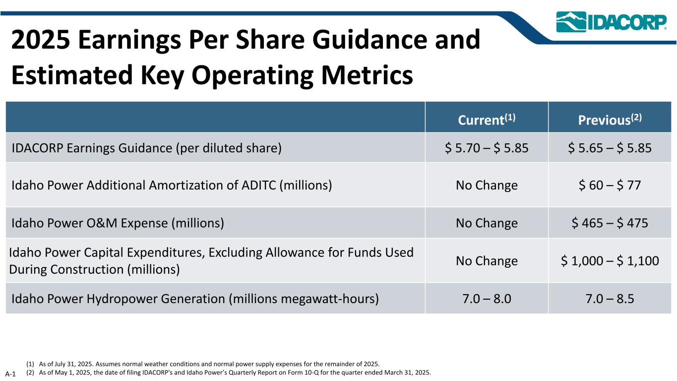 2025 Earnings Per Share Guidance and Estimated Key Operating Metrics Current(1) Previous(2) IDACORP Earnings Guidance (per diluted share) $ 5.70 – $ 5.85 $ 5.65 – $ 5.85 Idaho Power Additional Amortization of ADITC (millions) No Change $ 60 – $ 77 Idaho Power O&M Expense (millions) No Change $ 465 – $ 475 Idaho Power Capital Expenditures, Excluding Allowance for Funds Used During Construction (millions) No Change $ 1,000 – $ 1,100 Idaho Power Hydropower Generation (millions megawatt-hours) 7.0 – 8.0 7.0 – 8.5 (1) As of July 31, 2025. Assumes normal weather conditions and normal power supply expenses for the remainder of 2025. (2) As of May 1, 2025, the date of filing IDACORP's and Idaho Power’s Quarterly Report on Form 10-Q for the quarter ended March 31, 2025.A-1
