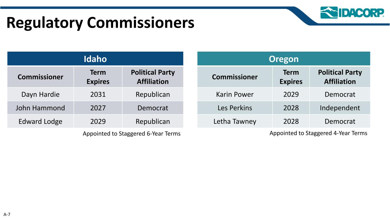 Regulatory Commissioners A-7 Idaho Commissioner Term Expires Political Party Affiliation Dayn Hardie 2031 Republican John Hammond 2027 Democrat Edward Lodge 2029 Republican Oregon Commissioner Term Expires Political Party Affiliation Karin Power 2029 Democrat Les Perkins 2028 Independent Letha Tawney 2028 Democrat Appointed to Staggered 6-Year Terms Appointed to Staggered 4-Year Terms