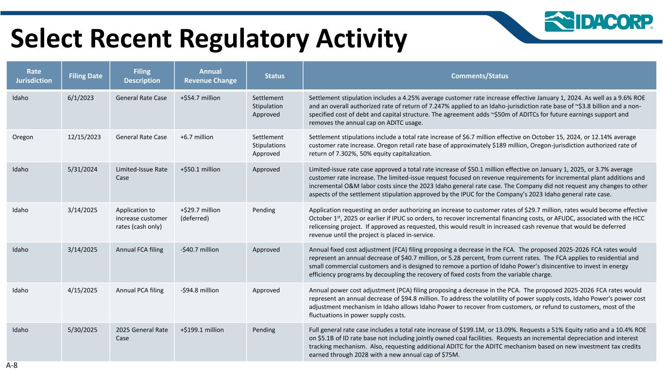 Select Recent Regulatory Activity Rate Jurisdiction Filing Date Filing Description Annual Revenue Change Status Comments/Status Idaho 6/1/2023 General Rate Case +$54.7 million Settlement Stipulation Approved Settlement stipulation includes a 4.25% average customer rate increase effective January 1, 2024. As well as a 9.6% ROE and an overall authorized rate of return of 7.247% applied to an Idaho-jurisdiction rate base of ~$3.8 billion and a non- specified cost of debt and capital structure. The agreement adds ~$50m of ADITCs for future earnings support and removes the annual cap on ADITC usage. Oregon 12/15/2023 General Rate Case +6.7 million Settlement Stipulations Approved Settlement stipulations include a total rate increase of $6.7 million effective on October 15, 2024, or 12.14% average customer rate increase. Oregon retail rate base of approximately $189 million, Oregon-jurisdiction authorized rate of return of 7.302%, 50% equity capitalization. Idaho 5/31/2024 Limited-Issue Rate Case +$50.1 million Approved Limited-issue rate case approved a total rate increase of $50.1 million effective on January 1, 2025, or 3.7% average customer rate increase. The limited-issue request focused on revenue requirements for incremental plant additions and incremental O&M labor costs since the 2023 Idaho general rate case. The Company did not request any changes to other aspects of the settlement stipulation approved by the IPUC for the Company’s 2023 Idaho general rate case. Idaho 3/14/2025 Application to increase customer rates (cash only) +$29.7 million (deferred) Pending Application requesting an order authorizing an increase to customer rates of $29.7 million, rates would become effective October 1st, 2025 or earlier if IPUC so orders, to recover incremental financing costs, or AFUDC, associated with the HCC relicensing project. If approved as requested, this would result in increased cash revenue that would be deferred revenue until the project is placed in-service. Idaho 3/14/2025 Annual FCA filing -$40.7 million Approved Annual fixed cost adjustment (FCA) filing proposing a decrease in the FCA. The proposed 2025-2026 FCA rates would represent an annual decrease of $40.7 million, or 5.28 percent, from current rates. The FCA applies to residential and small commercial customers and is designed to remove a portion of Idaho Power’s disincentive to invest in energy efficiency programs by decoupling the recovery of fixed costs from the variable charge. Idaho 4/15/2025 Annual PCA filing -$94.8 million Approved Annual power cost adjustment (PCA) filing proposing a decrease in the PCA. The proposed 2025-2026 FCA rates would represent an annual decrease of $94.8 million. To address the volatility of power supply costs, Idaho Power's power cost adjustment mechanism in Idaho allows Idaho Power to recover from customers, or refund to customers, most of the fluctuations in power supply costs. Idaho 5/30/2025 2025 General Rate Case +$199.1 million Pending Full general rate case includes a total rate increase of $199.1M, or 13.09%. Requests a 51% Equity ratio and a 10.4% ROE on $5.1B of ID rate base not including jointly owned coal facilities. Requests an incremental depreciation and interest tracking mechanism. Also, requesting additional ADITC for the ADITC mechanism based on new investment tax credits earned through 2028 with a new annual cap of $75M. A-8