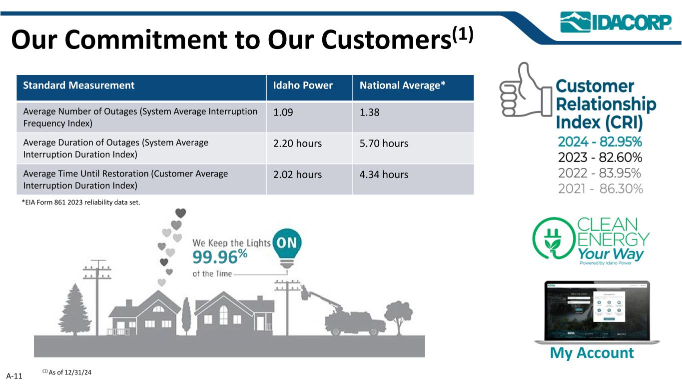 My Account Our Commitment to Our Customers(1) A-11 Standard Measurement Idaho Power National Average* Average Number of Outages (System Average Interruption Frequency Index) 1.09 1.38 Average Duration of Outages (System Average Interruption Duration Index) 2.20 hours 5.70 hours Average Time Until Restoration (Customer Average Interruption Duration Index) 2.02 hours 4.34 hours *EIA Form 861 2023 reliability data set. (1) As of 12/31/24 99.96%