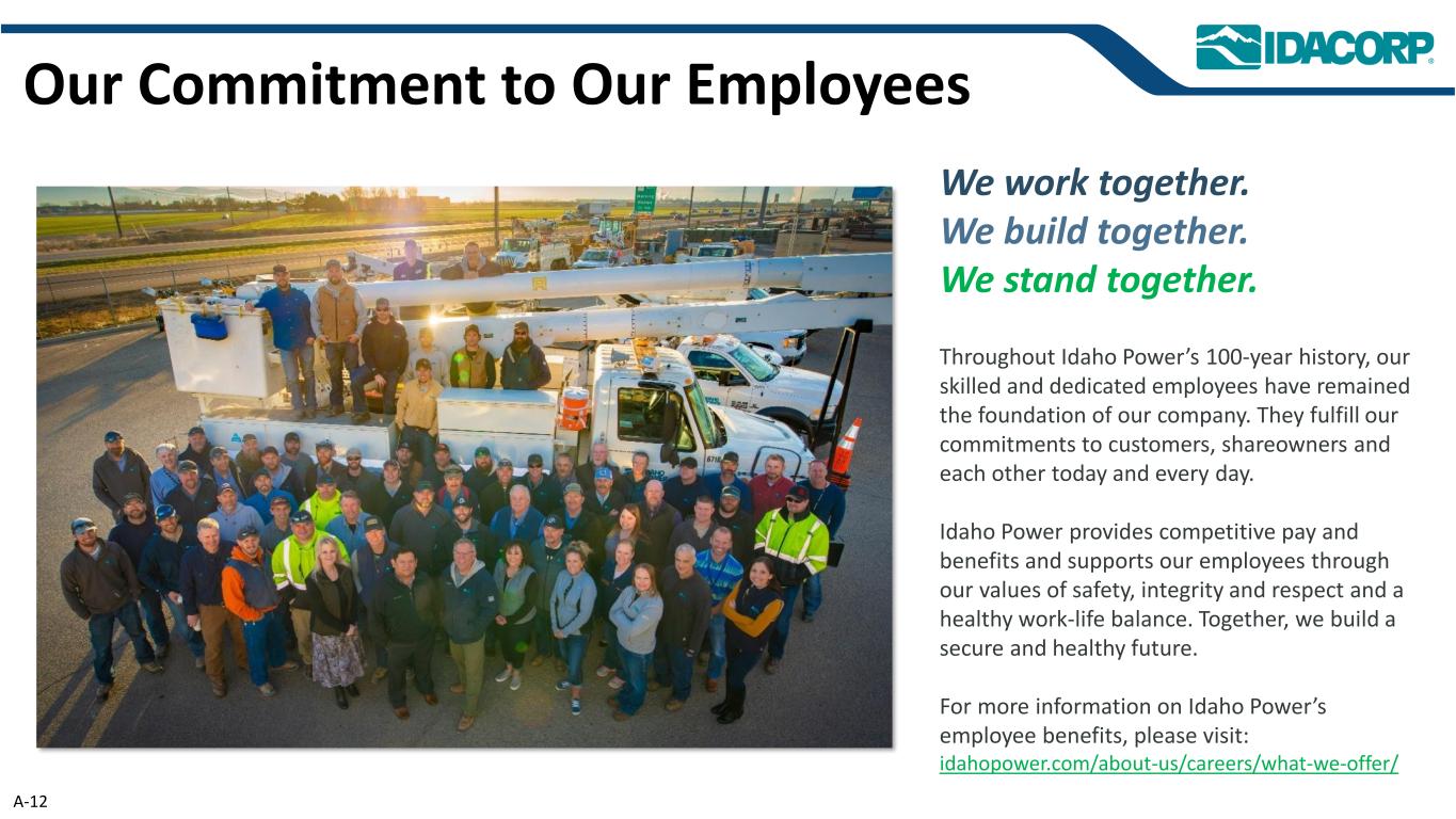 A-12 We work together. We build together. We stand together. Throughout Idaho Power’s 100-year history, our skilled and dedicated employees have remained the foundation of our company. They fulfill our commitments to customers, shareowners and each other today and every day. Idaho Power provides competitive pay and benefits and supports our employees through our values of safety, integrity and respect and a healthy work-life balance. Together, we build a secure and healthy future. For more information on Idaho Power’s employee benefits, please visit: idahopower.com/about-us/careers/what-we-offer/ Our Commitment to Our Employees