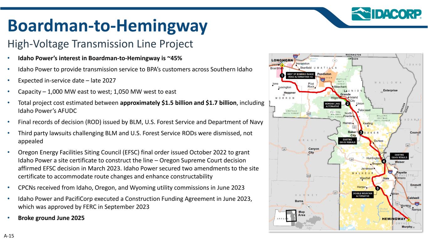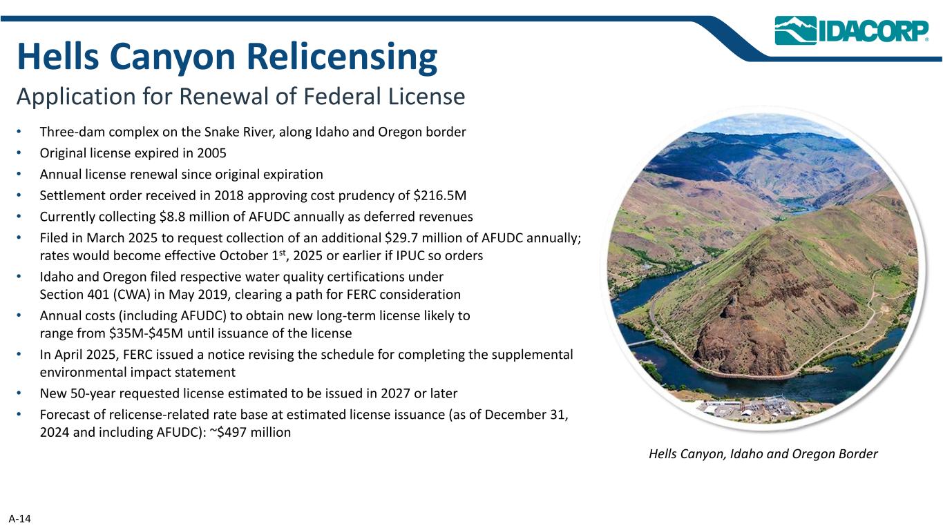 • Three-dam complex on the Snake River, along Idaho and Oregon border • Original license expired in 2005 • Annual license renewal since original expiration • Settlement order received in 2018 approving cost prudency of $216.5M • Currently collecting $8.8 million of AFUDC annually as deferred revenues • Filed in March 2025 to request collection of an additional $29.7 million of AFUDC annually; rates would become effective October 1st, 2025 or earlier if IPUC so orders • Idaho and Oregon filed respective water quality certifications under Section 401 (CWA) in May 2019, clearing a path for FERC consideration • Annual costs (including AFUDC) to obtain new long-term license likely to range from $35M-$45M until issuance of the license • In April 2025, FERC issued a notice revising the schedule for completing the supplemental environmental impact statement • New 50-year requested license estimated to be issued in 2027 or later • Forecast of relicense-related rate base at estimated license issuance (as of December 31, 2024 and including AFUDC): ~$497 million Hells Canyon Relicensing Application for Renewal of Federal License Hells Canyon, Idaho and Oregon Border A-14