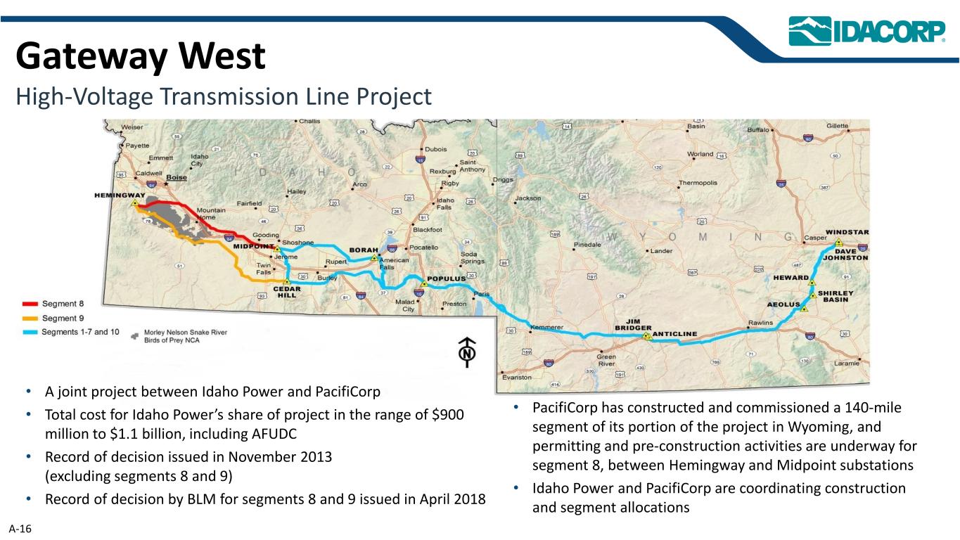 • Idaho Power’s interest in Boardman-to-Hemingway is ~45% • Idaho Power to provide transmission service to BPA’s customers across Southern Idaho • Expected in-service date – late 2027 • Capacity – 1,000 MW east to west; 1,050 MW west to east • Total project cost estimated between approximately $1.5 billion and $1.7 billion, including Idaho Power’s AFUDC • Final records of decision (ROD) issued by BLM, U.S. Forest Service and Department of Navy • Third party lawsuits challenging BLM and U.S. Forest Service RODs were dismissed, not appealed • Oregon Energy Facilities Siting Council (EFSC) final order issued October 2022 to grant Idaho Power a site certificate to construct the line – Oregon Supreme Court decision affirmed EFSC decision in March 2023. Idaho Power secured two amendments to the site certificate to accommodate route changes and enhance constructability • CPCNs received from Idaho, Oregon, and Wyoming utility commissions in June 2023 • Idaho Power and PacifiCorp executed a Construction Funding Agreement in June 2023, which was approved by FERC in September 2023 • Broke ground June 2025 Boardman-to-Hemingway High-Voltage Transmission Line Project A-15